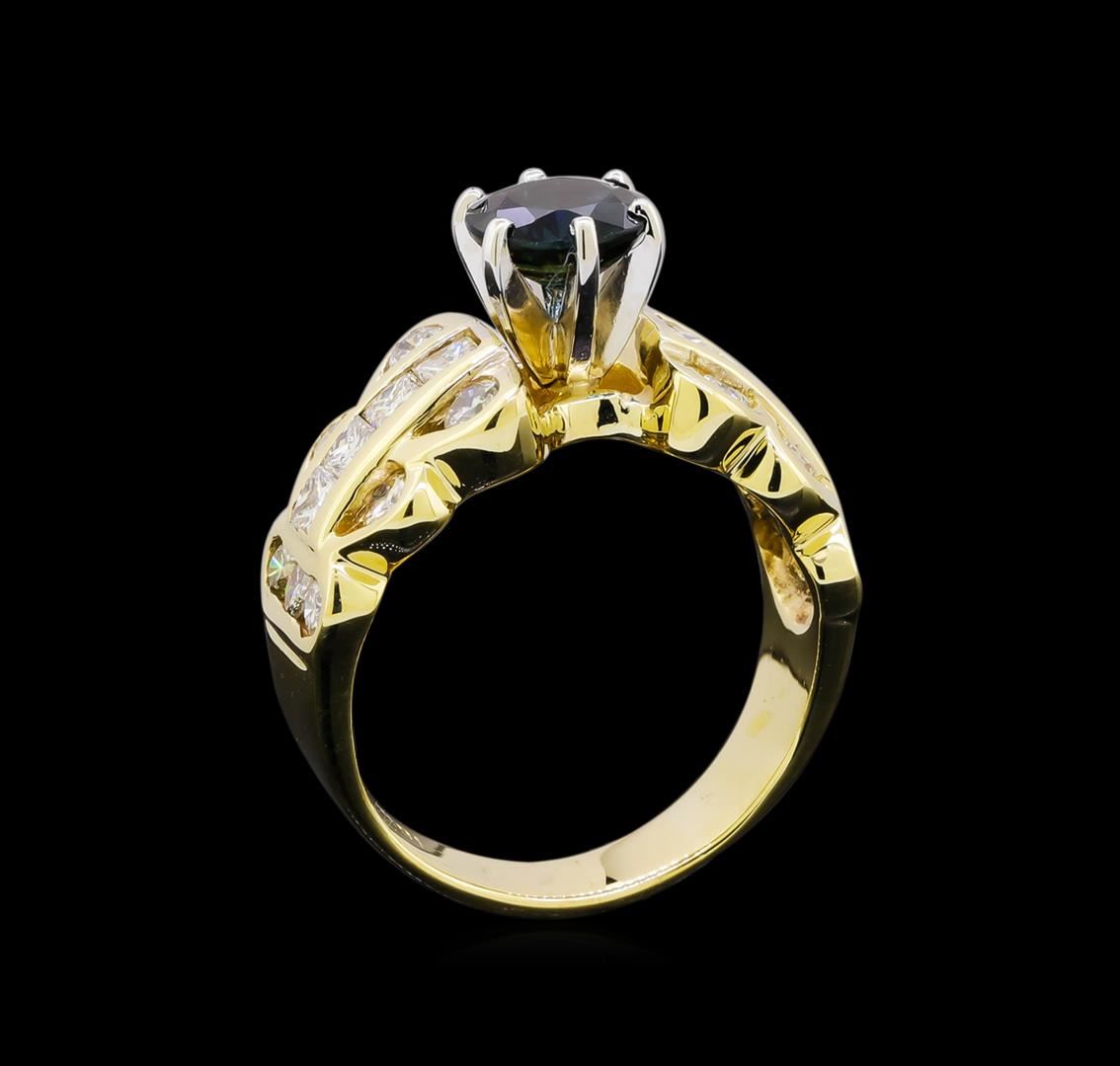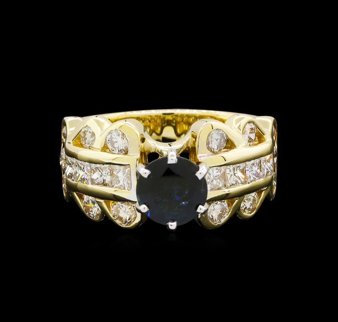One electronically tested 18KT yellow gold lady's combination cast & assembled fashion ring with a three row wide band with a bright polish finish. The featured lady's ring has a shank measuring 4.45 millimeters in width. Identified with markings of "18K". Condition is new, good workmanship. Containing: One prong set round brilliant cut natural blue sapphire, measuring 6.81 - 6.72 x 3.90 mm, (depth est.) approximate weight of 1.41ct., clarity is eye clean, dark, strong, blue color, (GIA B 7/5), cut is very good. Colored gemstones are presumed to have been subjected to commonly used enhancement processes. Graded in the setting. Eight channel set princess cut diamonds, measuring 2.50 x 2.40 x 1.80mm (depth est.) approximate total weight of 8 Stones = 0.80ct. Graded in the setting. Clarity: VS-1 to SI-1. Color: H - I. Cut Good Fourteen channel set round brilliant cut diamonds, measuring 2.70 - 2.40 x 1.58mm (depth est.) approximate total weight of 14 Stones = 0.90ct. Graded in the setting. Clarity: VS-2 to SI-1. Color: H - J. Cut Good. Total Weight of Colored Stones 1.41ct. Total Weight of Diamonds 1.70ct. Total Weight of Ring 8.20gm. GAS Appraised at $7,570.00.