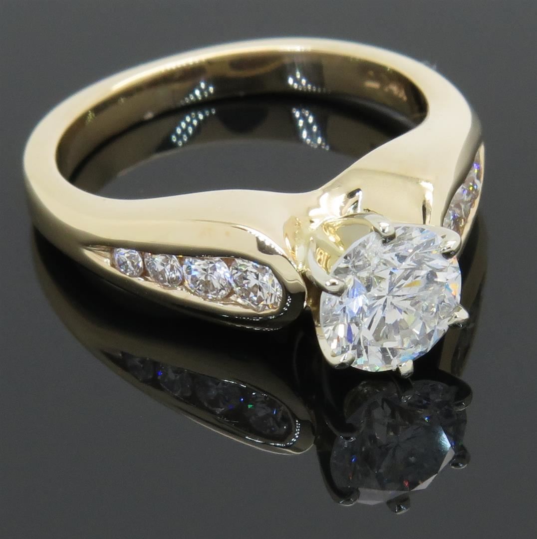 One tested 14K yellow gold diamond ring. Containing: One Round Brilliant Cut Diamond. Approximate Size: 1.06CT, Clarity: I, Color: G-H. 8 Round Brilliant Cut Diamonds. Approximate total diamond weight: 1.41CTW. Diamonds are graded in the mounting, unless otherwise stated. Weight of ring: 5.5 grams. Size: 5.75.