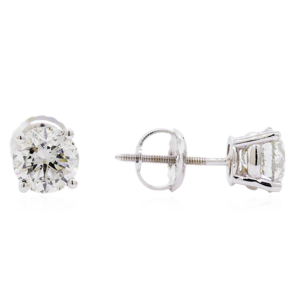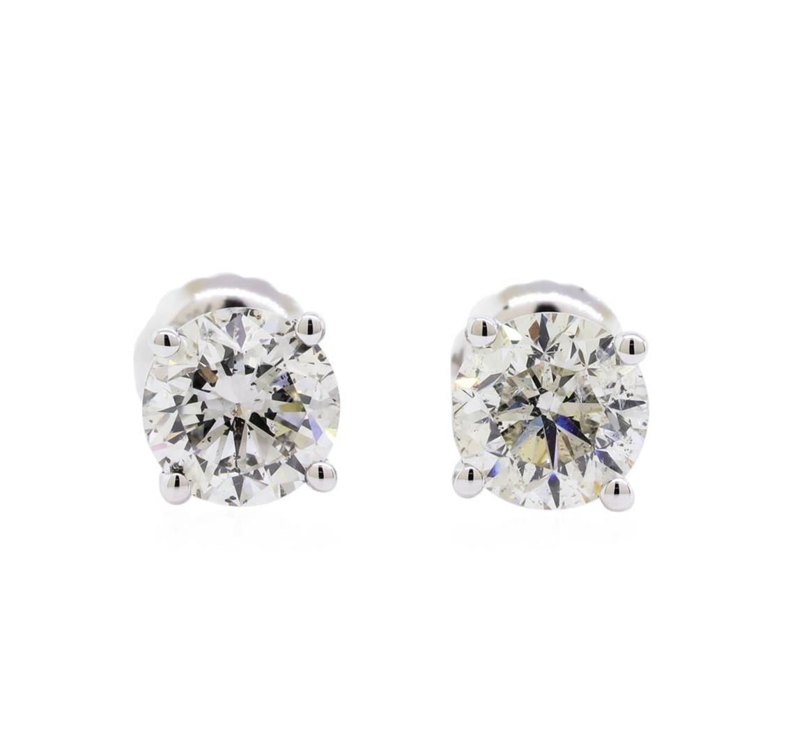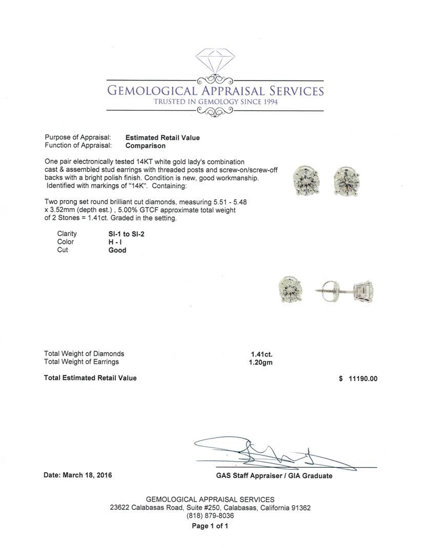 One pair electronically tested 14KT white gold lady's combination cast & assembled stud earrings with threaded posts and screw-on/screw-off backs with a bright polish finish. Identified with markings of "14K". Condition is new, good workmanship. Containing: Two prong set round brilliant cut diamonds, measuring 5.51 - 5.48 x 3.52mm (depth est.) , 5.00.%. GTCF approximate total weight of 2 Stones = 1.41ct. Graded in the setting. Clarity: SI-1 to SI-2. Color: H - I. Cut Good. Total Weight of Diamonds 1.41ct. Total Weight of Earrings 1.20gm. GAS Appraised at $11,190.00.