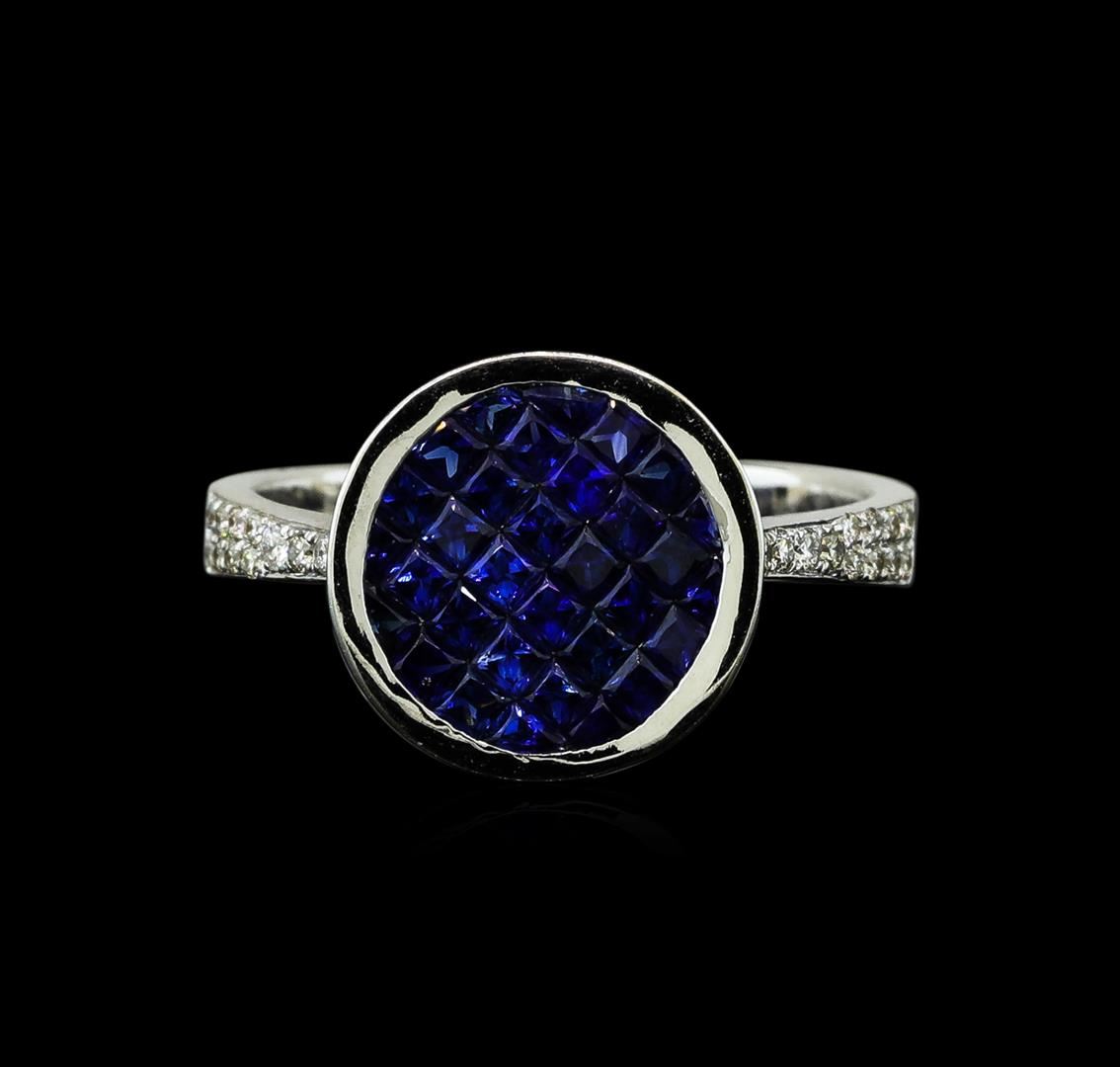 One electronically tested 14KT white gold lady's cast fashion ring with a halo with a bright polish finish. The featured lady's ring has a shank measuring 3.15 millimeters wide. Identified with markings of '14K'. Condition is new, good workmanship. Containing: Thirty-two invisible set princess modified brilliant cut natural blue sapphires, measuring 1.95 x 1.85 x 1.20mm, (depth est.) approximate total weight of 1.42ct., clarity is eye clean, medium dark, moderately strong, blue color, (GIA B 6/4), cut is very good. Transmitting light with no distortion, transparent. Colored gemstones are presumed to have been subjected to commonly used enhancement processes. Graded in the setting. Ten bead set round brilliant cut diamonds, measuring 1.40 - 1.35 x 0.86mm (depth est.) approximate total weight of 10 Stones = 0.10ct. Graded in the setting. Clarity VS-2 to SI-2. Color: H - I Cut Good Fifty-Six bead set round brilliant cut diamonds, measuring 1.20 - 1.15 x 0.73mm (depth est.) approximate total weight of 56 Stones = 0.34ct. Graded in the setting. Clarity VS-2 to SI-2. Color: H - I Cut Good. Total Weight of Colored Stones 1.42ct.. Total Weight of Diamonds 0.44ct.. Total Weight of Ring 3.80gm GAS Appraised at $4,010.00.