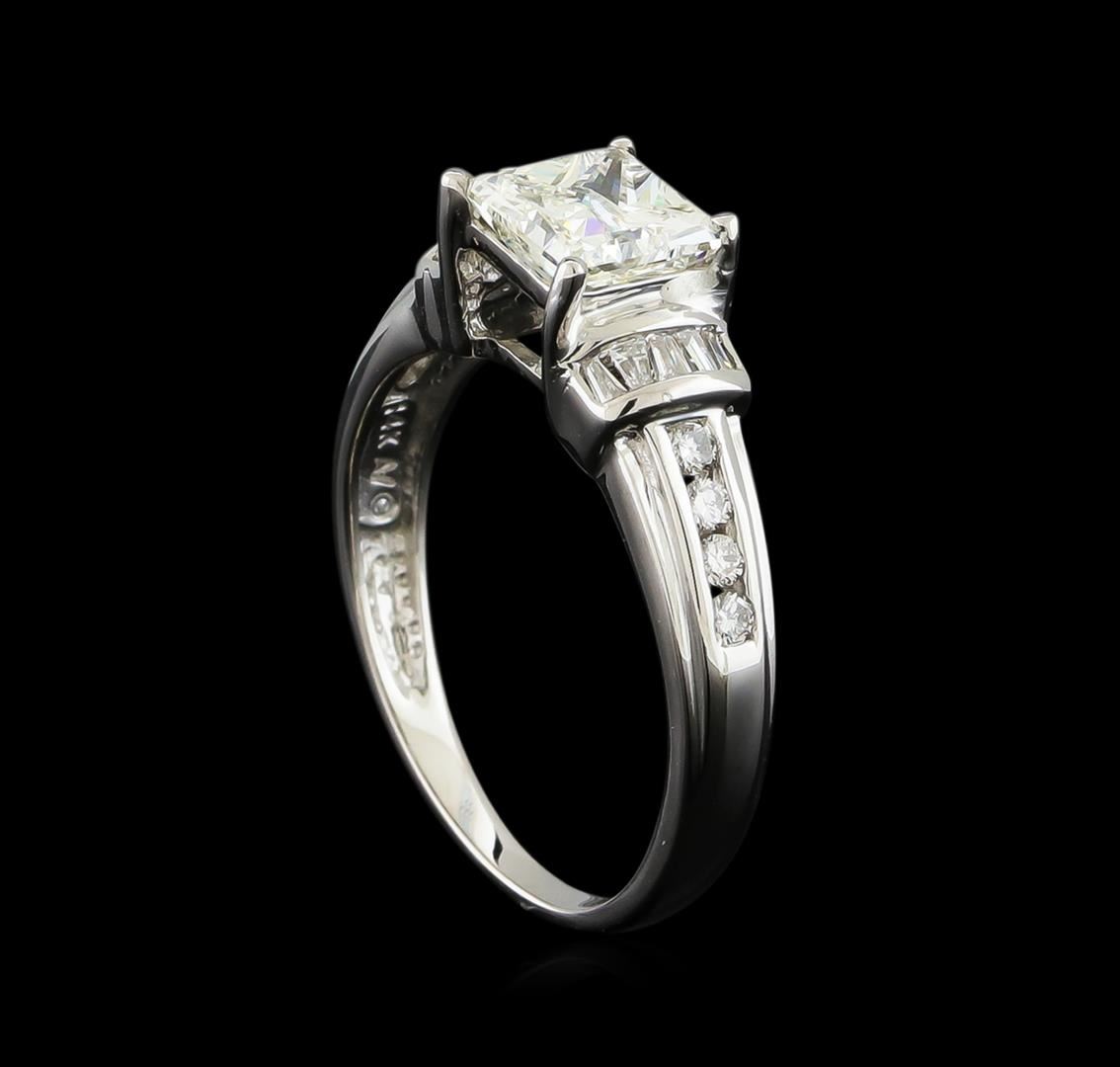 One electronically tested 14KT white gold lady's cast wedding ring with a cathedral shank with a bright polish finish. The featured lady's ring has a shank measuring 1.53 millimeters wide. Identified with markings of "14K". Condition is new, good workmanship. Containing: One prong set princess cut diamond, measuring 5.67 x 5.55 x 3.70mm (depth est.) , 5.00.%. GTCF approximate weight of 1.05ct. Graded in the setting. Clarity: I-1. Color: Good Ten channel set baguette cut (tapered) diamonds, measuring from 1.75 x 1.20 x 1.02mm (depth est.) to 1.80 x 1.20 x 1.02mm (depth est.) approximate total weight of 10 Stones = 0.20ct. Graded in the setting. Clarity: VS-2 to SI-2. Color: F - Good Eight channel set round brilliant cut diamonds, measuring 1.80 - 1.75 x 1.10mm (depth est.) approximate total weight of 8 Stones = 0.17ct. Graded in the setting. Clarity: VS-2 to SI-1. Color: G - Very Good. Total Weight of Diamonds 1.42ct. Total Weight of Ring 2.70gm GAS Appraised at $10,205.00.