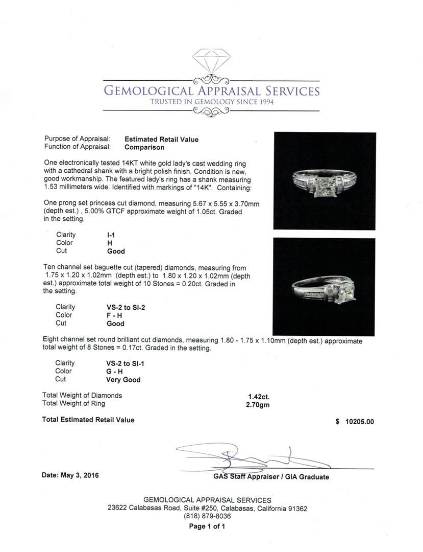 One electronically tested 14KT white gold lady's cast wedding ring with a cathedral shank with a bright polish finish. The featured lady's ring has a shank measuring 1.53 millimeters wide. Identified with markings of "14K". Condition is new, good workmanship. Containing: One prong set princess cut diamond, measuring 5.67 x 5.55 x 3.70mm (depth est.) , 5.00.%. GTCF approximate weight of 1.05ct. Graded in the setting. Clarity: I-1. Color: Good Ten channel set baguette cut (tapered) diamonds, measuring from 1.75 x 1.20 x 1.02mm (depth est.) to 1.80 x 1.20 x 1.02mm (depth est.) approximate total weight of 10 Stones = 0.20ct. Graded in the setting. Clarity: VS-2 to SI-2. Color: F - Good Eight channel set round brilliant cut diamonds, measuring 1.80 - 1.75 x 1.10mm (depth est.) approximate total weight of 8 Stones = 0.17ct. Graded in the setting. Clarity: VS-2 to SI-1. Color: G - Very Good. Total Weight of Diamonds 1.42ct. Total Weight of Ring 2.70gm GAS Appraised at $10,205.00.