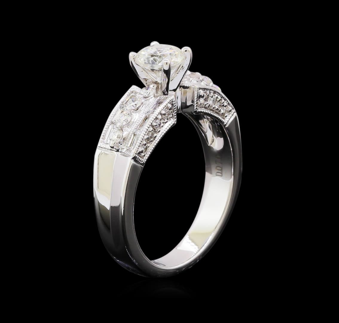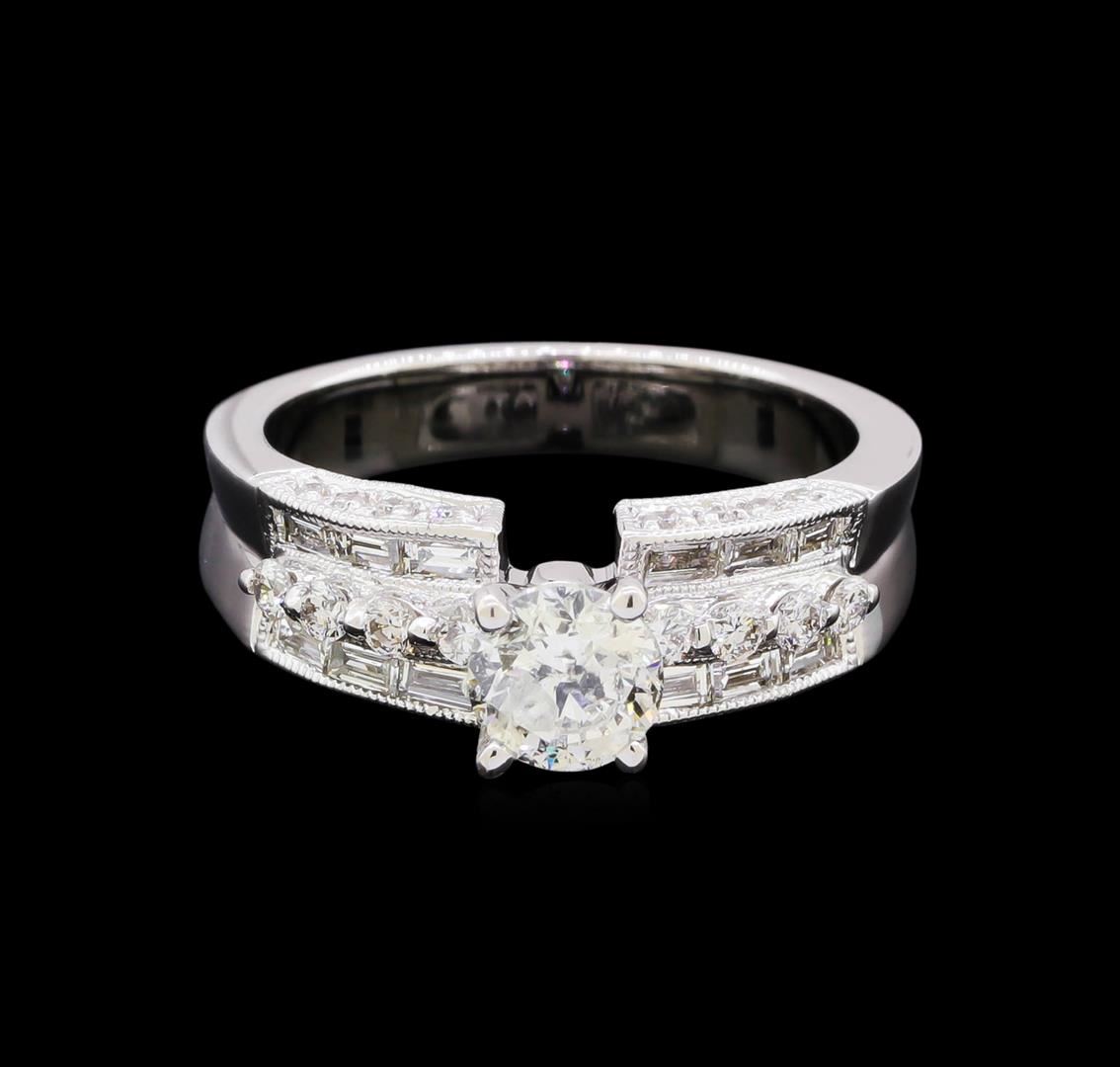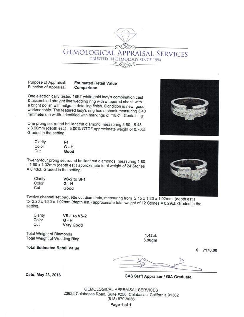 One electronically tested 18KT white gold lady's combination cast & assembled straight line wedding ring with a tapered shank with a bright polish with milgrain detailing finish. The featured lady's ring has a shank measuring 3.40 millimeters in width. Identified with markings of "18K". Condition is new, good workmanship. Containing: One prong set round brilliant cut diamond, measuring 5.50 - 5.48 x 3.60mm (depth est.) , 5.00.%. GTCF approximate weight of 0.70ct. Graded in the setting. Clarity: I-1. Color: G - Good Twenty-Four prong set round brilliant cut diamonds, measuring 1.80 - 1.60 x 1.02mm (depth est.) approximate total weight of 24 Stones = 0.43ct. Graded in the setting. Clarity: VS-2 to SI-1. Color: G - Good Twelve channel set baguette cut diamonds, measuring from 2.15 x 1.20 x 1.02mm (depth est.) to 2.20 x 1.20 x 1.02mm (depth est.) approximate total weight of 12 Stones = 0.29ct. Graded in the setting. Clarity: VS-1 to VS-2. Color: G - Very Good. Total Weight of Diamonds 1.42ct. Total Weight of Wedding Ring 6.90gm. GAS Appraised at $7,170.00.