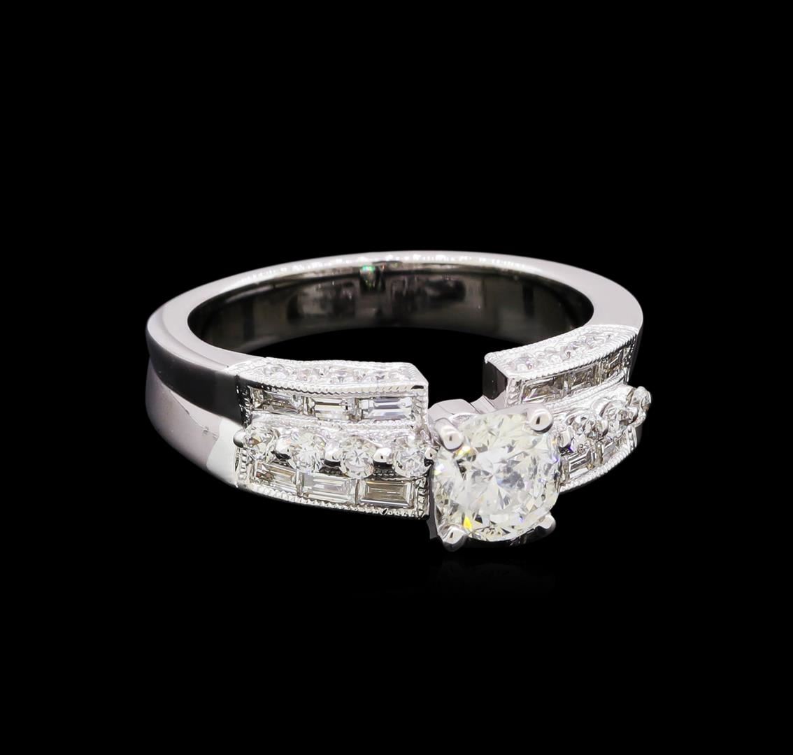 One electronically tested 18KT white gold lady's combination cast & assembled straight line wedding ring with a tapered shank with a bright polish with milgrain detailing finish. The featured lady's ring has a shank measuring 3.40 millimeters in width. Identified with markings of "18K". Condition is new, good workmanship. Containing: One prong set round brilliant cut diamond, measuring 5.50 - 5.48 x 3.60mm (depth est.) , 5.00.%. GTCF approximate weight of 0.70ct. Graded in the setting. Clarity: I-1. Color: G - Good Twenty-Four prong set round brilliant cut diamonds, measuring 1.80 - 1.60 x 1.02mm (depth est.) approximate total weight of 24 Stones = 0.43ct. Graded in the setting. Clarity: VS-2 to SI-1. Color: G - Good Twelve channel set baguette cut diamonds, measuring from 2.15 x 1.20 x 1.02mm (depth est.) to 2.20 x 1.20 x 1.02mm (depth est.) approximate total weight of 12 Stones = 0.29ct. Graded in the setting. Clarity: VS-1 to VS-2. Color: G - Very Good. Total Weight of Diamonds 1.42ct. Total Weight of Wedding Ring 6.90gm. GAS Appraised at $7,170.00.