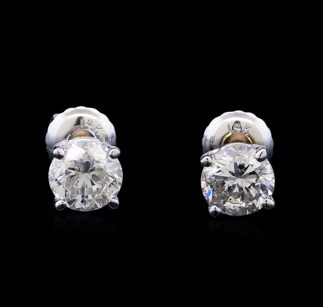 One pair electronically tested 14KT white gold lady's combination cast & assembled diamond stud earrings with threaded posts and screw-on/screw-off backs with a basket setting with a bright polish finish. Identified with markings of "14K". Condition is new, good workmanship. Containing: One prong set round brilliant cut diamond, measuring 5.49 - 5.46 x 3.78mm (depth est.) approximate weight of 0.72ct. Graded in the setting. Clarity: I-1. Color: G. Cut Very Good One prong set round brilliant cut diamond, measuring 5.48 - 5.44 x 3.71mm (depth est.) , 3.00.%. GTCF approximate weight of 0.70ct. Graded in the setting. Clarity: SI-3. Color: Good. Total Weight of Diamonds 1.42ct. Total Weight of Stud Earrings 1.10gm. GAS Appraised at $10,005.00.