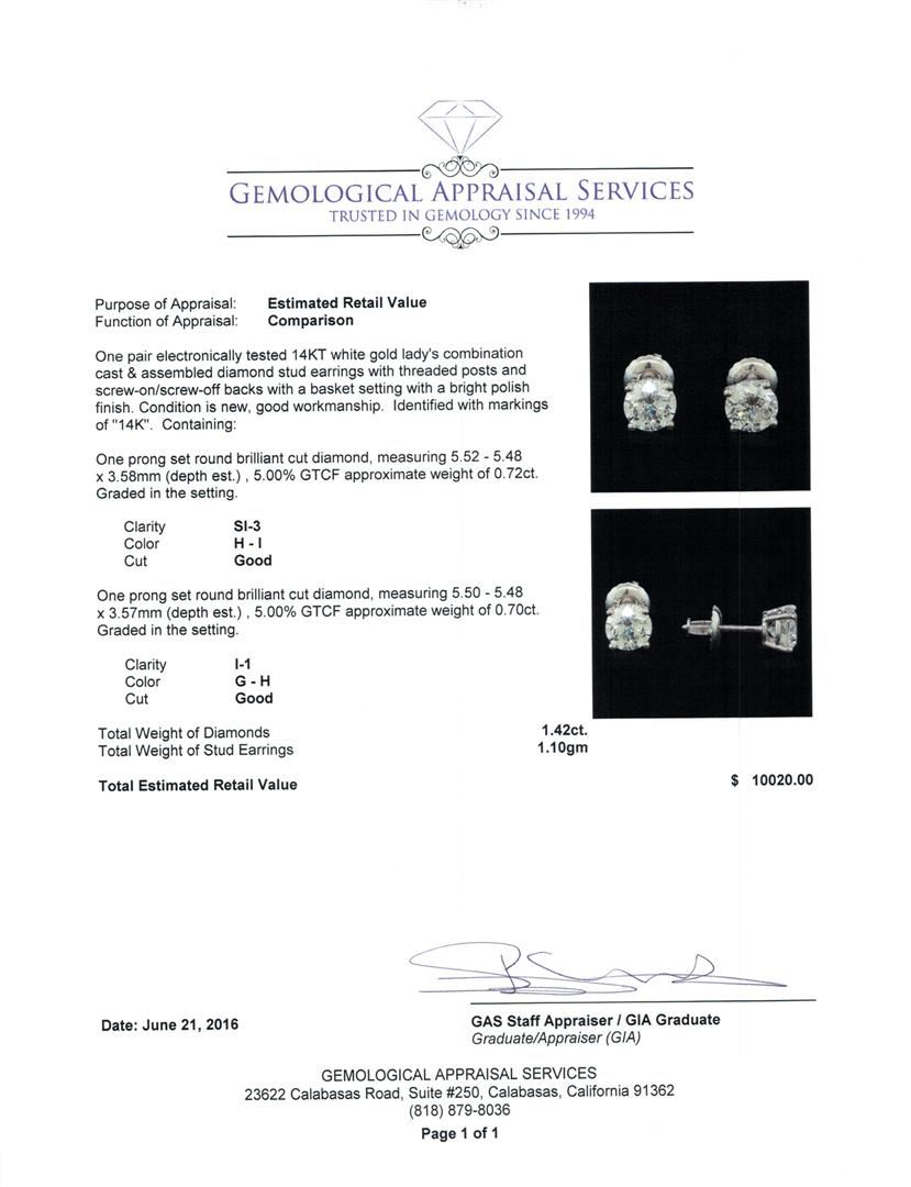 One pair electronically tested 14KT white gold lady's combination cast & assembled diamond stud earrings with threaded posts and screw-on/screw-off backs with a basket setting with a bright polish finish. Identified with markings of "14K". Condition is new, good workmanship. Containing: One prong set round brilliant cut diamond, measuring 5.52 - 5.48 x 3.58mm (depth est.) , 5.00.%. GTCF approximate weight of 0.72ct. Graded in the setting. Clarity: SI-3. Color: H - I. Cut Good One prong set round brilliant cut diamond, measuring 5.50 - 5.48 x 3.57mm (depth est.) , 5.00.%. GTCF approximate weight of 0.70ct. Graded in the setting. Clarity: I-1. Color: G - Good. Total Weight of Diamonds 1.42ct. Total Weight of Stud Earrings 1.10gm. GAS Appraised at $10,020.00.