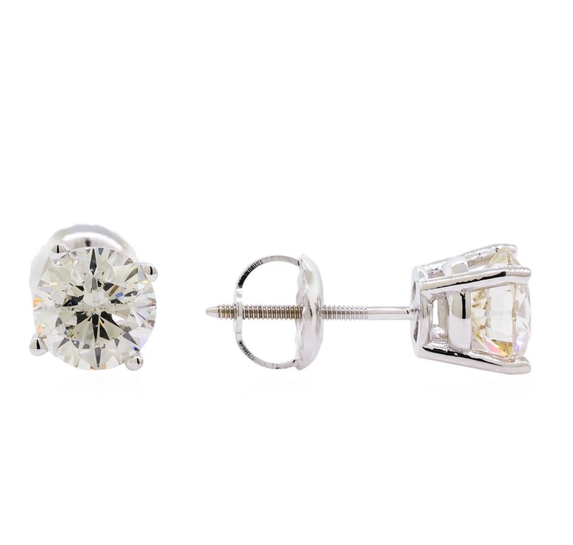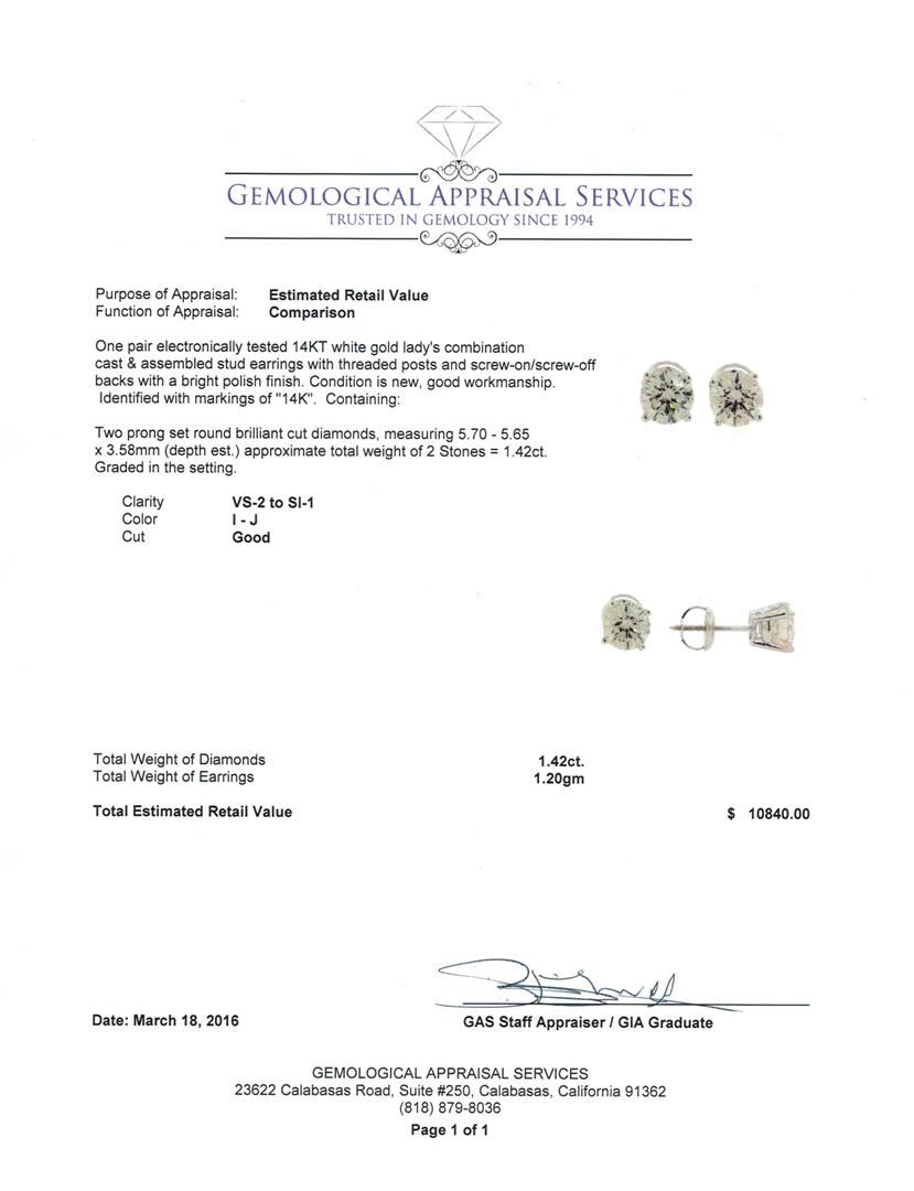 One pair electronically tested 14KT white gold lady's combination cast & assembled stud earrings with threaded posts and screw-on/screw-off backs with a bright polish finish. Identified with markings of "14K". Condition is new, good workmanship. Containing: Two prong set round brilliant cut diamonds, measuring 5.70 - 5.65 x 3.58mm (depth est.) approximate total weight of 2 Stones = 1.42ct. Graded in the setting. Clarity: VS-2 to SI-1. Color: I - Good. Total Weight of Diamonds 1.42ct. Total Weight of Earrings 1.20gm. GAS Appraised at $10,840.00.