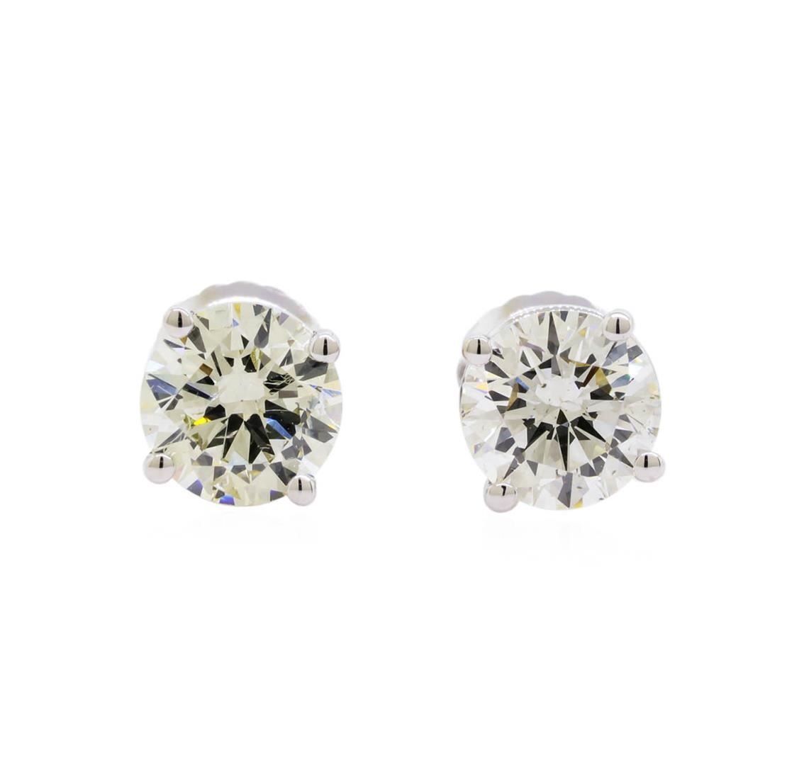 One pair electronically tested 14KT white gold lady's combination cast & assembled stud earrings with threaded posts and screw-on/screw-off backs with a bright polish finish. Identified with markings of "14K". Condition is new, good workmanship. Containing: Two prong set round brilliant cut diamonds, measuring 5.82 - 5.74 x 3.47mm (depth est.) approximate total weight of 2 Stones = 1.42ct. Graded in the setting. Clarity: SI-1. Color: H - I. Cut Good. Total Weight of Diamonds 1.42ct. Total Weight of Earrings 1.20gm. GAS Appraised at $11,265.00.