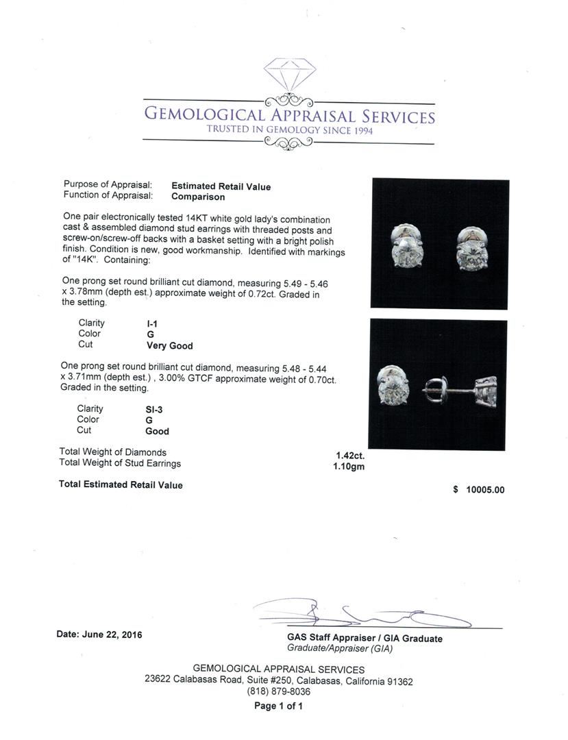 One pair electronically tested 14KT white gold lady's combination cast & assembled diamond stud earrings with threaded posts and screw-on/screw-off backs with a basket setting with a bright polish finish. Identified with markings of "14K". Condition is new, good workmanship. Containing: One prong set round brilliant cut diamond, measuring 5.49 - 5.46 x 3.78mm (depth est.) approximate weight of 0.72ct. Graded in the setting. Clarity: I-1. Color: G. Cut Very Good One prong set round brilliant cut diamond, measuring 5.48 - 5.44 x 3.71mm (depth est.) , 3.00.%. GTCF approximate weight of 0.70ct. Graded in the setting. Clarity: SI-3. Color: Good. Total Weight of Diamonds 1.42ct. Total Weight of Stud Earrings 1.10gm. GAS Appraised at $10,005.00.