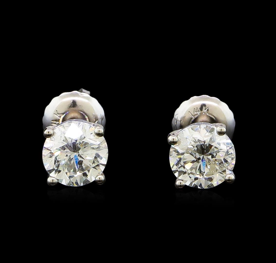 One pair electronically tested 14KT white gold lady's combination cast & assembled diamond stud earrings with threaded posts and screw-on/screw-off backs with a basket setting with a bright polish finish. Identified with markings of "14K". Condition is new, good workmanship. Containing: One prong set round brilliant cut diamond, measuring 5.52 - 5.48 x 3.58mm (depth est.) , 5.00.%. GTCF approximate weight of 0.72ct. Graded in the setting. Clarity: SI-3. Color: H - I. Cut Good One prong set round brilliant cut diamond, measuring 5.50 - 5.48 x 3.57mm (depth est.) , 5.00.%. GTCF approximate weight of 0.70ct. Graded in the setting. Clarity: I-1. Color: G - Good. Total Weight of Diamonds 1.42ct. Total Weight of Stud Earrings 1.10gm. GAS Appraised at $10,020.00.