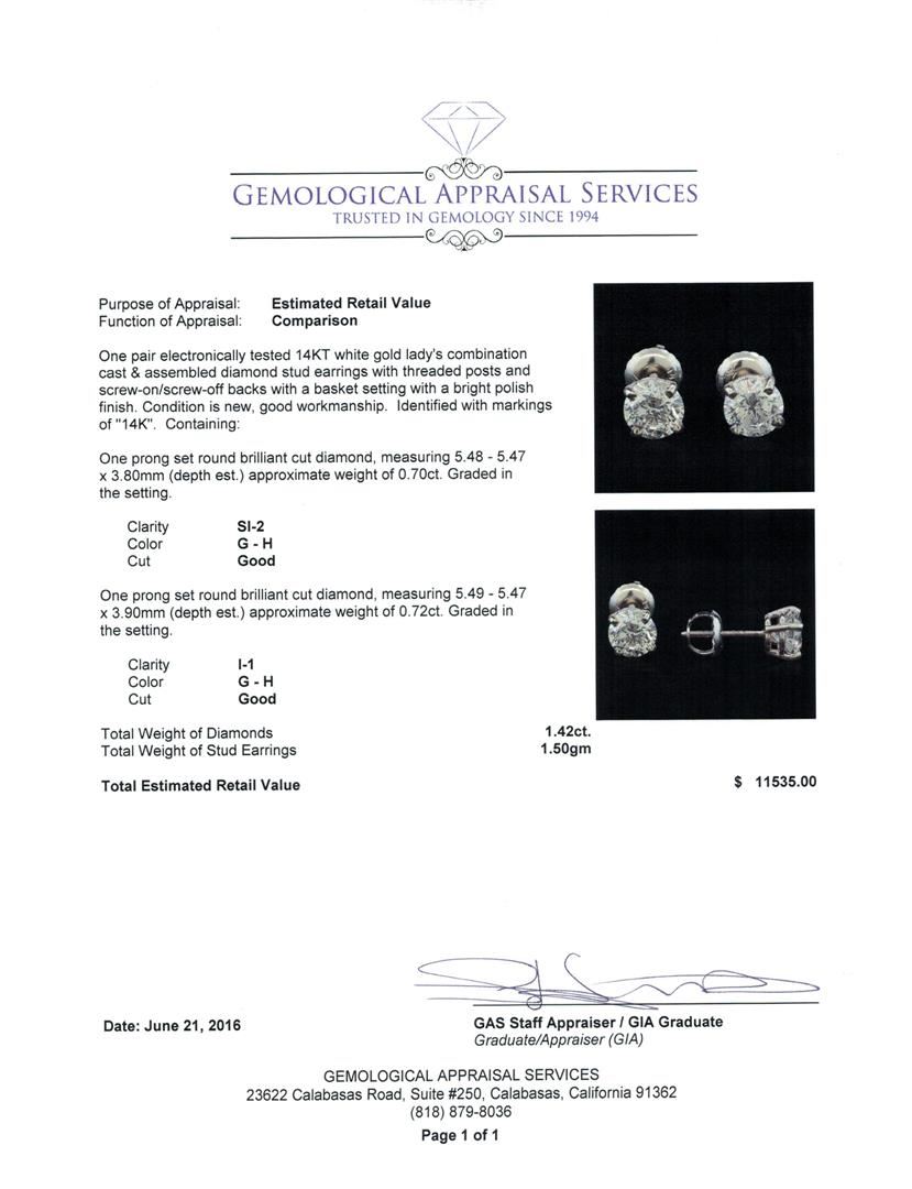 One pair electronically tested 14KT white gold lady's combination cast & assembled diamond stud earrings with threaded posts and screw-on/screw-off backs with a basket setting with a bright polish finish. Identified with markings of "14K". Condition is new, good workmanship. Containing: One prong set round brilliant cut diamond, measuring 5.48 - 5.47 x 3.80mm (depth est.) approximate weight of 0.70ct. Graded in the setting. Clarity: SI-2. Color: G - Good One prong set round brilliant cut diamond, measuring 5.49 - 5.47 x 3.90mm (depth est.) approximate weight of 0.72ct. Graded in the setting. Clarity: I-1. Color: G - Good. Total Weight of Diamonds 1.42ct. Total Weight of Stud Earrings 1.50gm. GAS Appraised at $11,535.00.