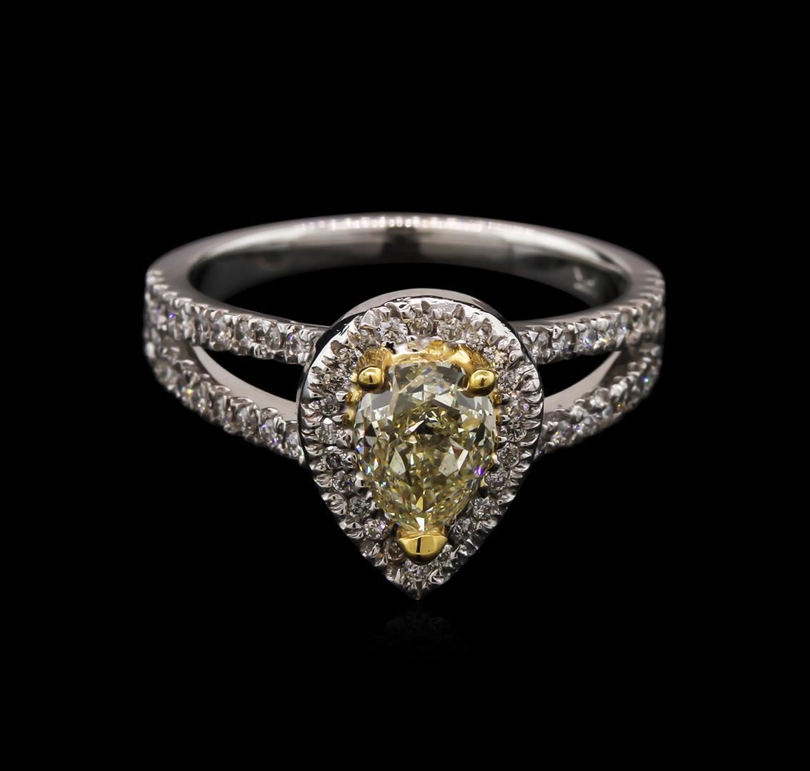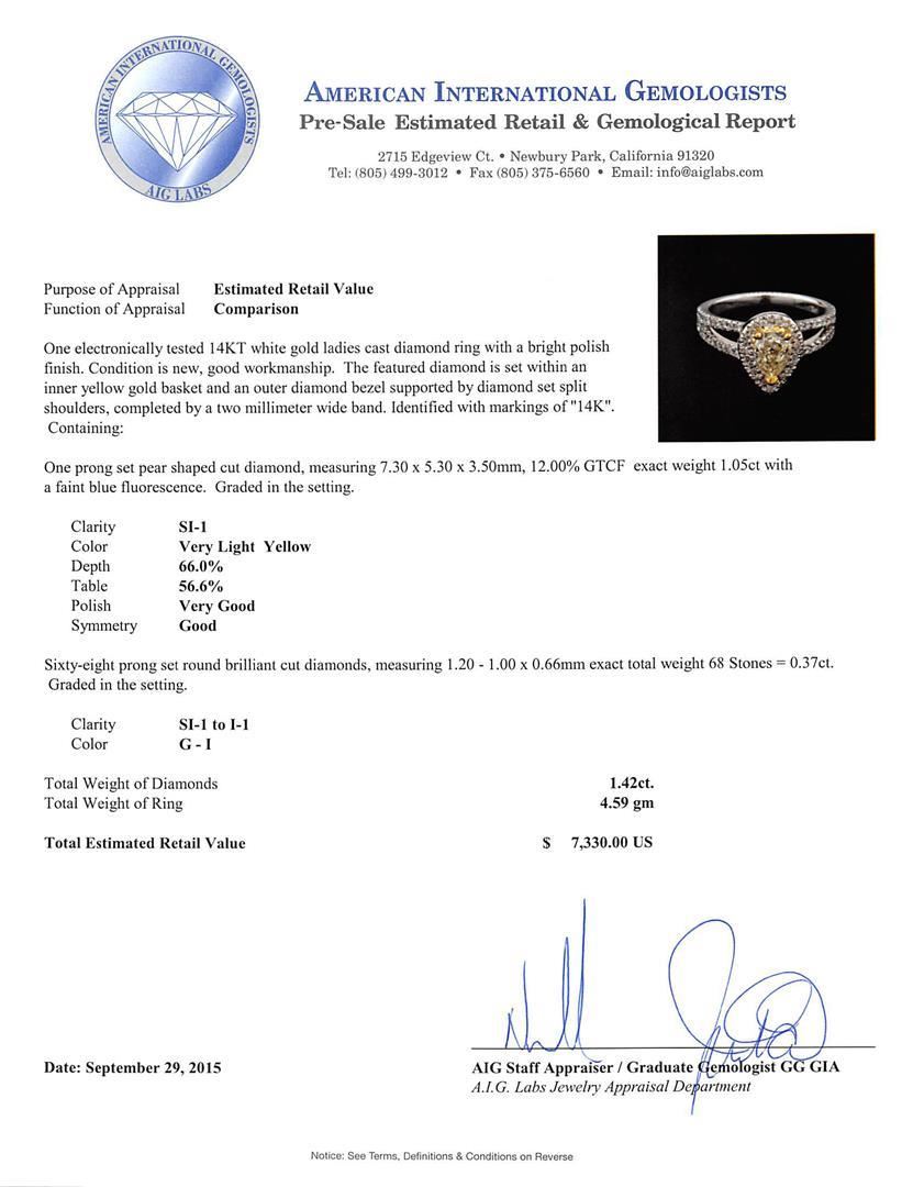 One electronically tested 14KT white gold ladies cast diamond ring with a bright polish finish. The featured diamond is set within an inner yellow gold basket and an outer diamond bezel supported by diamond set split shoulders, completed by a two millimeter wide band. Identified with markings of "14K". Condition is new, good workmanship. Containing: One prong set pear shaped cut diamond, measuring 7.30 x 5.30 x 3.50mm, 12.00.%. GTCF exact weight 1.05ct with a faint blue fluorescence. Graded in the setting. Clarity: SI-1. Depth: 66.0%. Table 56.6%. Sixty-Eight prong set round brilliant cut diamonds, measuring 1.20 - 1.00 x 0.66mm exact total weight 68 Stones = 0.37ct. Graded in the setting. Clarity: SI-1 to I-1. Color: G - I. Total Weight of Diamonds 1.42ct. Total Weight of Ring 4.59gm. AIG Appraised.