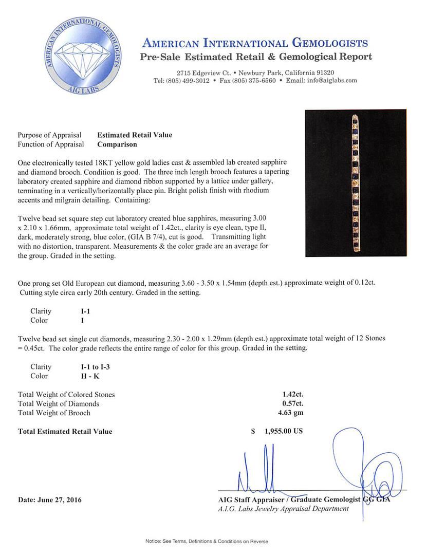 One electronically tested 18KT yellow gold ladies cast & assembled lab created sapphire and diamond brooch. The three inch length brooch features a tapering laboratory created sapphire and diamond ribbon supported by a lattice under gallery, terminating in a vertically/horizontally place pin. Bright polish finish with rhodium accents and milgrain detailing. Condition is good. Containing: Twelve bead set square step cut laboratory created blue sapphires, measuring 3.00 x 2.10 x 1.66mm, approximate total weight of 1.42ct., clarity is eye clean, type II, dark, moderately strong, blue color, (GIA B 7/4), cut is good. Transmitting light with no distortion, transparent. Measurements & the color grade are an average for the group. Graded in the setting. One prong set Old European cut diamond, measuring 3.60 - 3.50 x 1.54mm (depth est.) approximate weight of 0.12ct. Cutting style circa early 20th century. Graded in the setting. Clarity: I-1. Color: I Twelve bead set single cut diamonds, measuring 2.30 - 2.00 x 1.29mm (depth est.) approximate total weight of 12 Stones = 0.45ct. The color grade reflects the entire range of color for this group. Graded in the setting. Clarity: I-1 to I-3. Color: H - K. Total Weight of Colored Stones 1.42ct. Total Weight of Diamonds 0.57ct. Total Weight of Brooch 4.63gm. AIG Appraised at $1,955.00.