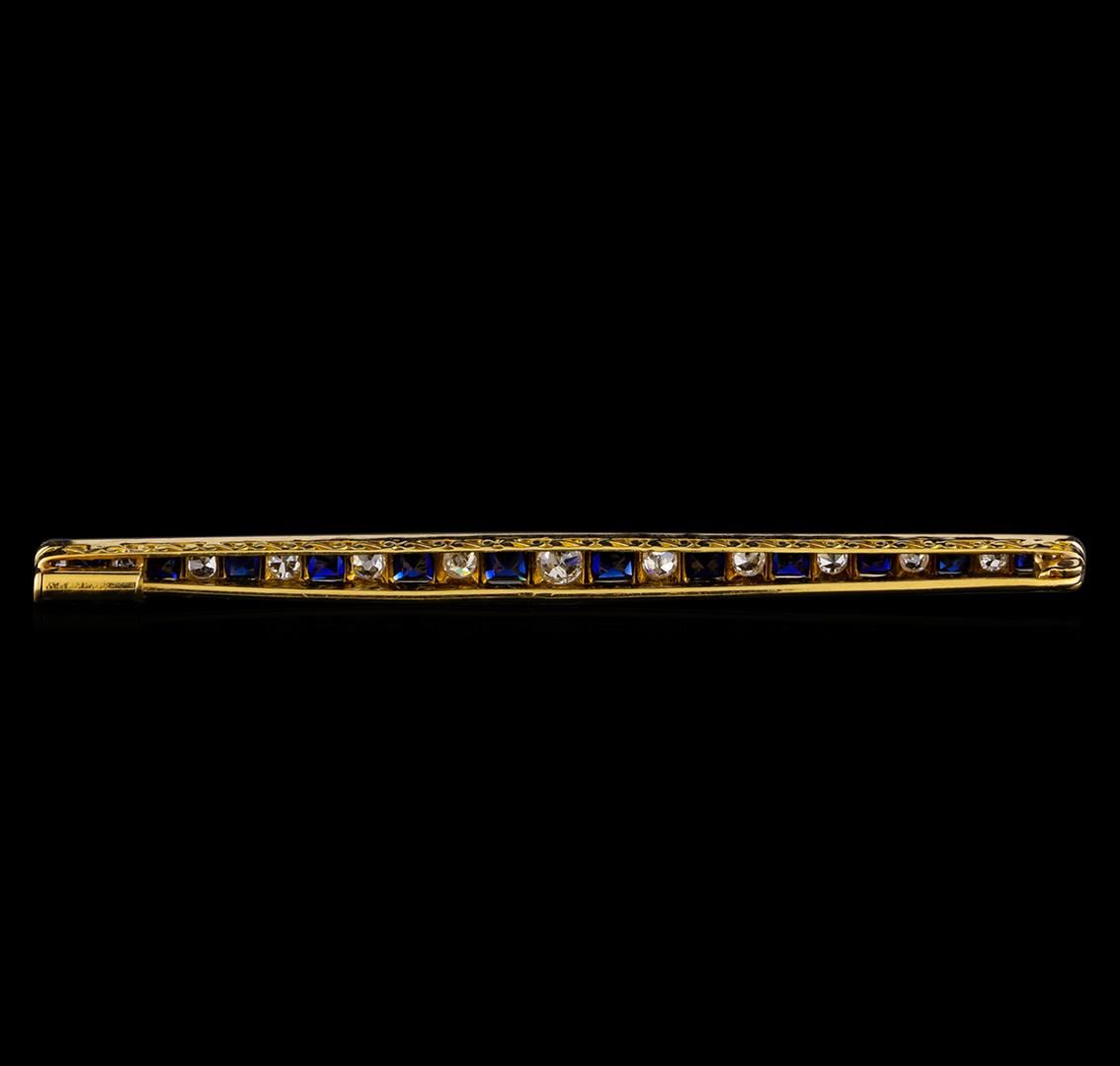 One electronically tested 18KT yellow gold ladies cast & assembled lab created sapphire and diamond brooch. The three inch length brooch features a tapering laboratory created sapphire and diamond ribbon supported by a lattice under gallery, terminating in a vertically/horizontally place pin. Bright polish finish with rhodium accents and milgrain detailing. Condition is good. Containing: Twelve bead set square step cut laboratory created blue sapphires, measuring 3.00 x 2.10 x 1.66mm, approximate total weight of 1.42ct., clarity is eye clean, type II, dark, moderately strong, blue color, (GIA B 7/4), cut is good. Transmitting light with no distortion, transparent. Measurements & the color grade are an average for the group. Graded in the setting. One prong set Old European cut diamond, measuring 3.60 - 3.50 x 1.54mm (depth est.) approximate weight of 0.12ct. Cutting style circa early 20th century. Graded in the setting. Clarity: I-1. Color: I Twelve bead set single cut diamonds, measuring 2.30 - 2.00 x 1.29mm (depth est.) approximate total weight of 12 Stones = 0.45ct. The color grade reflects the entire range of color for this group. Graded in the setting. Clarity: I-1 to I-3. Color: H - K. Total Weight of Colored Stones 1.42ct. Total Weight of Diamonds 0.57ct. Total Weight of Brooch 4.63gm. AIG Appraised at $1,955.00.