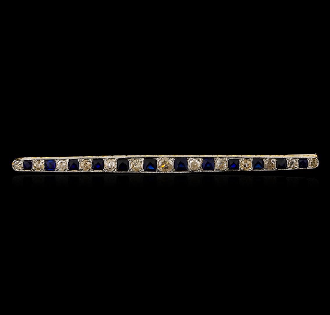 One electronically tested 18KT yellow gold ladies cast & assembled lab created sapphire and diamond brooch. The three inch length brooch features a tapering laboratory created sapphire and diamond ribbon supported by a lattice under gallery, terminating in a vertically/horizontally place pin. Bright polish finish with rhodium accents and milgrain detailing. Condition is good. Containing: Twelve bead set square step cut laboratory created blue sapphires, measuring 3.00 x 2.10 x 1.66mm, approximate total weight of 1.42ct., clarity is eye clean, type II, dark, moderately strong, blue color, (GIA B 7/4), cut is good. Transmitting light with no distortion, transparent. Measurements & the color grade are an average for the group. Graded in the setting. One prong set Old European cut diamond, measuring 3.60 - 3.50 x 1.54mm (depth est.) approximate weight of 0.12ct. Cutting style circa early 20th century. Graded in the setting. Clarity: I-1. Color: I Twelve bead set single cut diamonds, measuring 2.30 - 2.00 x 1.29mm (depth est.) approximate total weight of 12 Stones = 0.45ct. The color grade reflects the entire range of color for this group. Graded in the setting. Clarity: I-1 to I-3. Color: H - K. Total Weight of Colored Stones 1.42ct. Total Weight of Diamonds 0.57ct. Total Weight of Brooch 4.63gm. AIG Appraised at $1,955.00.