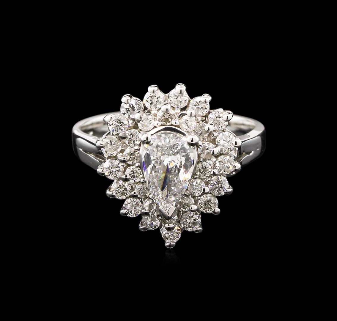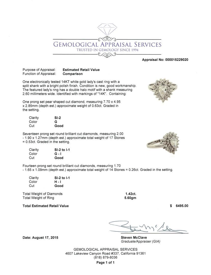 One electronically tested 14KT white gold lady's cast ring with a split shank with a bright polish finish. The featured lady's ring has a double halo motif with a shank measuring 2.60 millimeters wide. Identified with markings of "14K". Condition is new, good workmanship. Containing: One prong set pear shaped cut diamond, measuring 7.70 x 4.95 x 2.85mm (depth est.) approximate weight of 0.63ct. Graded in the setting. Clarity: SI-2. Color: G. Cut Good Seventeen prong set round brilliant cut diamonds, measuring 2.00 - 1.90 x 1.27mm (depth est.) approximate total weight of 17 Stones = 0.53ct. Graded in the setting. Clarity: SI-2 to I-1. Color: G - I. Cut Good Fourteen prong set round brilliant cut diamonds, measuring 1.70 - 1.65 x 1.09mm (depth est.) approximate total weight of 14 Stones = 0.26ct. Graded in the setting. Clarity: SI-2 to I-1. Color: H - I. Cut Good. Total Weight of Diamonds 1.42ct. Total Weight of Ring 5.60gm. GAS Appraised at $6,495.00.