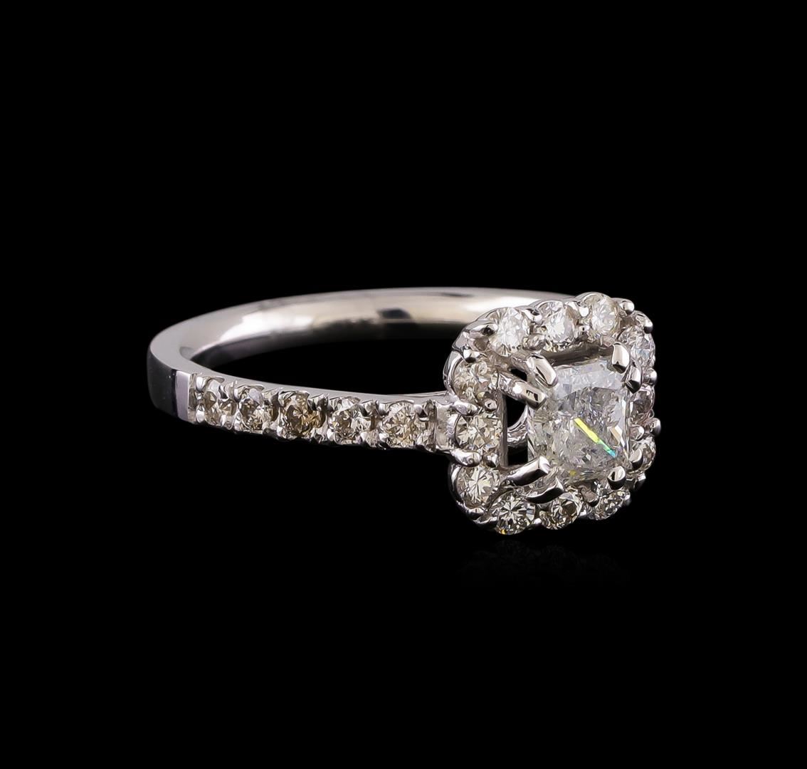 One electronically tested 14KT white gold lady's cast wedding ring with a cathedral halo with a bright polish finish. The featured lady's ring has a shank measuring 2.07 millimeters wide. Identified with markings of "14K". Condition is new, good workmanship. Containing: One prong set princess cut diamond, measuring 4.98 x 4.96 x 3.72mm (depth est.) approximate weight of 0.75ct. Graded in the setting. Clarity: I-2. Color: G - Good Twelve prong set round brilliant cut diamonds, measuring 2.10 - 2.00 x 1.27mm (depth est.) approximate total weight of 12 Stones = 0.40ct. Graded in the setting. Clarity: VS-2 to SI-1. Color: I - Good Ten prong set round brilliant cut diamonds, measuring 2.00 - 1.90 x 1.21mm (depth est.) approximate total weight of 10 Stones = 0.28ct. Graded in the setting. Clarity: SI-1 to SI-2. Color: I - Good. Total Weight of Diamonds 1.43ct. Total Weight of Ring 4.00gm. GAS Appraised at $4,885.00.