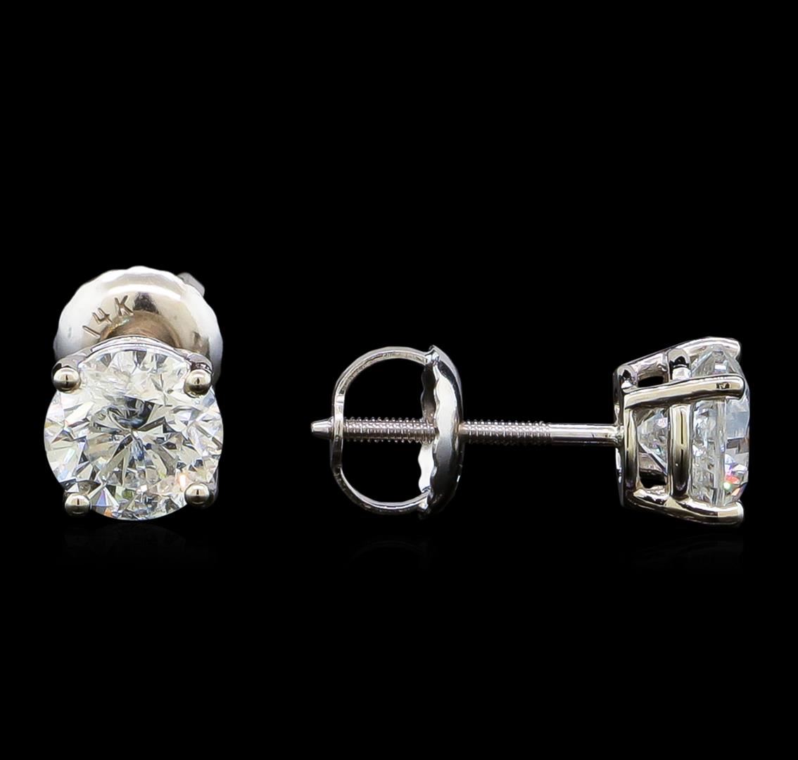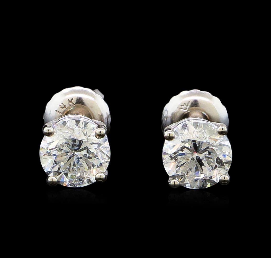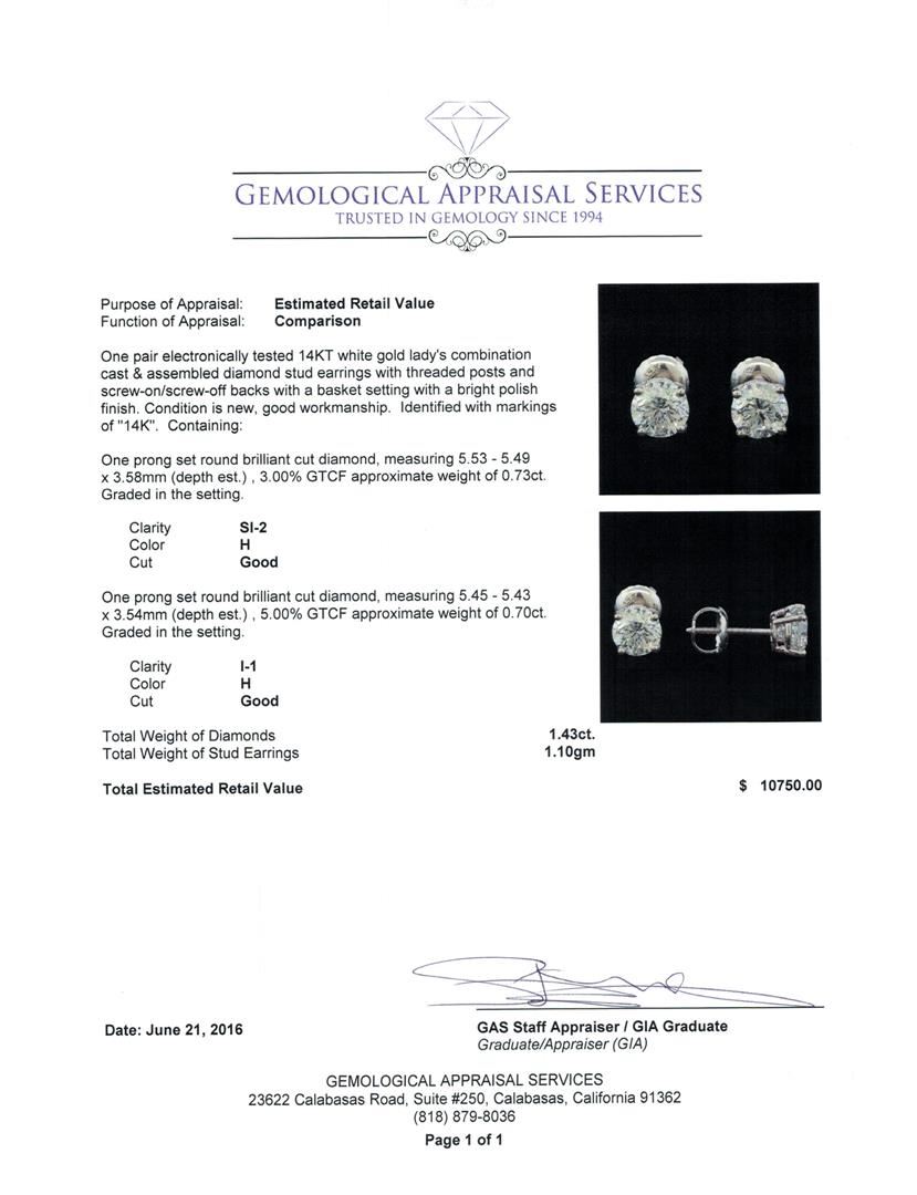 One pair electronically tested 14KT white gold lady's combination cast & assembled diamond stud earrings with threaded posts and screw-on/screw-off backs with a basket setting with a bright polish finish. Identified with markings of "14K". Condition is new, good workmanship. Containing: One prong set round brilliant cut diamond, measuring 5.53 - 5.49 x 3.58mm (depth est.) , 3.00.%. GTCF approximate weight of 0.73ct. Graded in the setting. Clarity: SI-2. Color: Good One prong set round brilliant cut diamond, measuring 5.45 - 5.43 x 3.54mm (depth est.) , 5.00.%. GTCF approximate weight of 0.70ct. Graded in the setting. Clarity: I-1. Color: Good. Total Weight of Diamonds 1.43ct. Total Weight of Stud Earrings 1.10gm. GAS Appraised at $10,750.00.