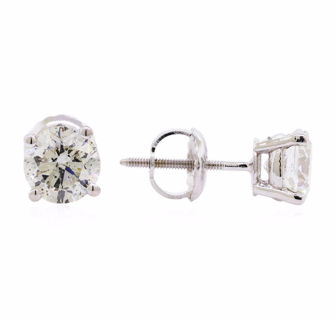 One pair electronically tested 14KT white gold lady's combination cast & assembled stud earrings with threaded posts and screw-on/screw-off backs with a bright polish finish. Identified with markings of "14K". Condition is new, good workmanship. Containing: Two prong set round brilliant cut diamonds, measuring 5.51 - 5.47 x 3.51mm (depth est.) , 6.00.%. GTCF approximate total weight of 2 Stones = 1.43ct. Graded in the setting. Clarity: SI-1 to SI-2. Color: H - I. Cut Very Good. Total Weight of Diamonds 1.43ct. Total Weight of Earrings 1.20gm. GAS Appraised at $11,795.00.