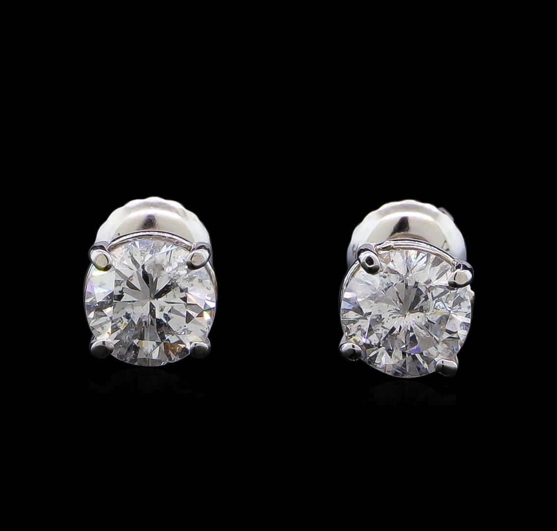 One pair electronically tested 14KT white gold lady's combination cast & assembled diamond stud earrings with threaded posts and screw-on/screw-off backs with a basket setting with a bright polish finish. Identified with markings of "14K". Condition is new, good workmanship. Containing: One prong set round brilliant cut diamond, measuring 5.68 - 5.65 x 3.63mm (depth est.) approximate weight of 0.72ct. Graded in the setting. Clarity: SI-3. Color: Good One prong set round brilliant cut diamond, measuring 5.69 - 5.64 x 3.63mm (depth est.) approximate weight of 0.71ct. Graded in the setting. Clarity: I-1. Color: Good. Total Weight of Diamonds 1.43ct. Total Weight of Stud Earrings 1.40gm. GAS Appraised at $10,125.00.