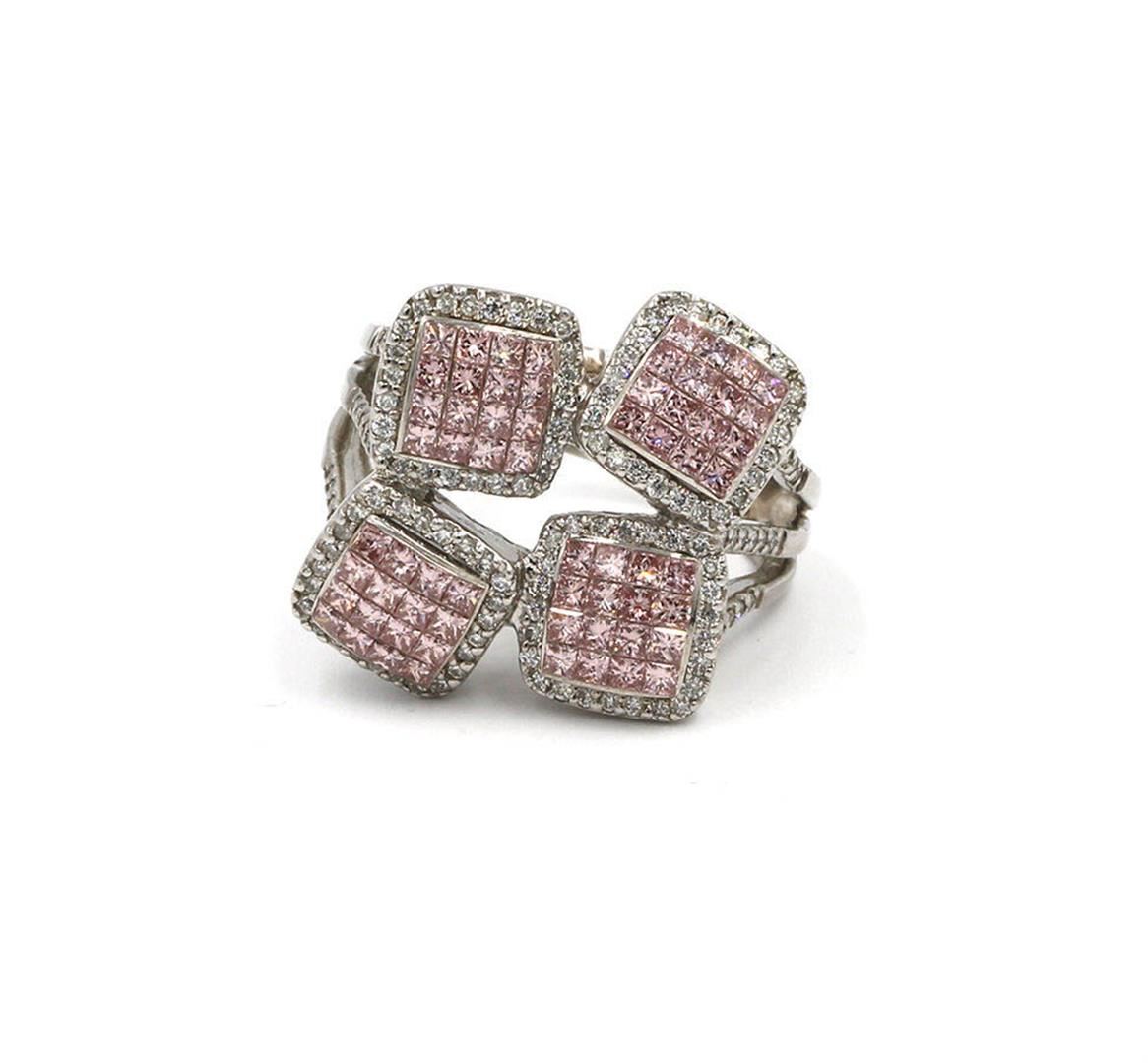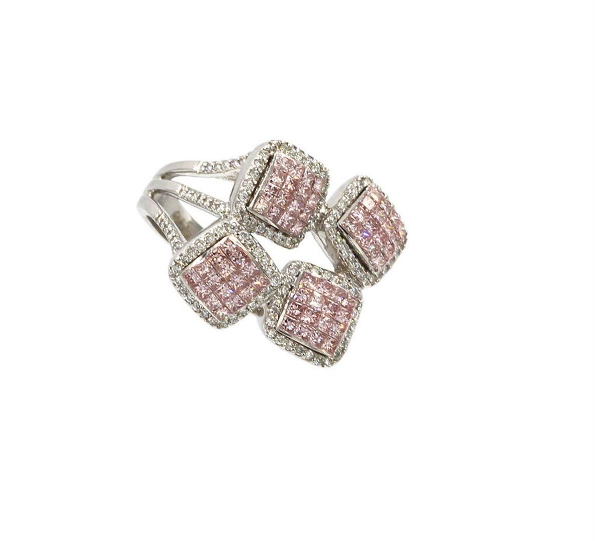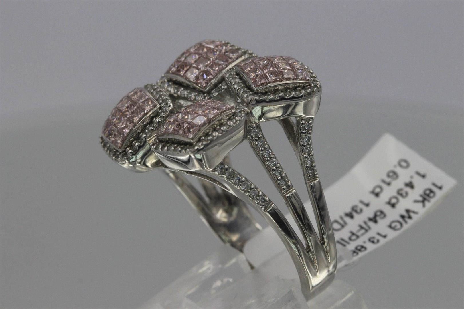 One lady's wedding ring featuring: 18KT white gold weighing 13.88 grams containing one center pink diamond weighing 1.43ct and 134 side diamonds weighing 0.61ctw. The pink diamond is color enhanced and princess cut with fine clarity and fancy pink color w