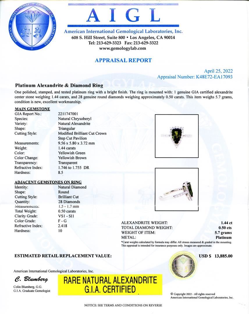 1.44ct Alexandrite and 0.50ctw Diamond Platinum Ring (GIA CERTIFIED). Please see Photos and Description for all available information. This is a GIA CERTIFIED ring. This is a 1.44ct Alexandrite and 0.50ctw Diamond Platinum Ring. The ring is size 6 3/4. This is a beautiful ring. I will include the appraisal with the ring.
