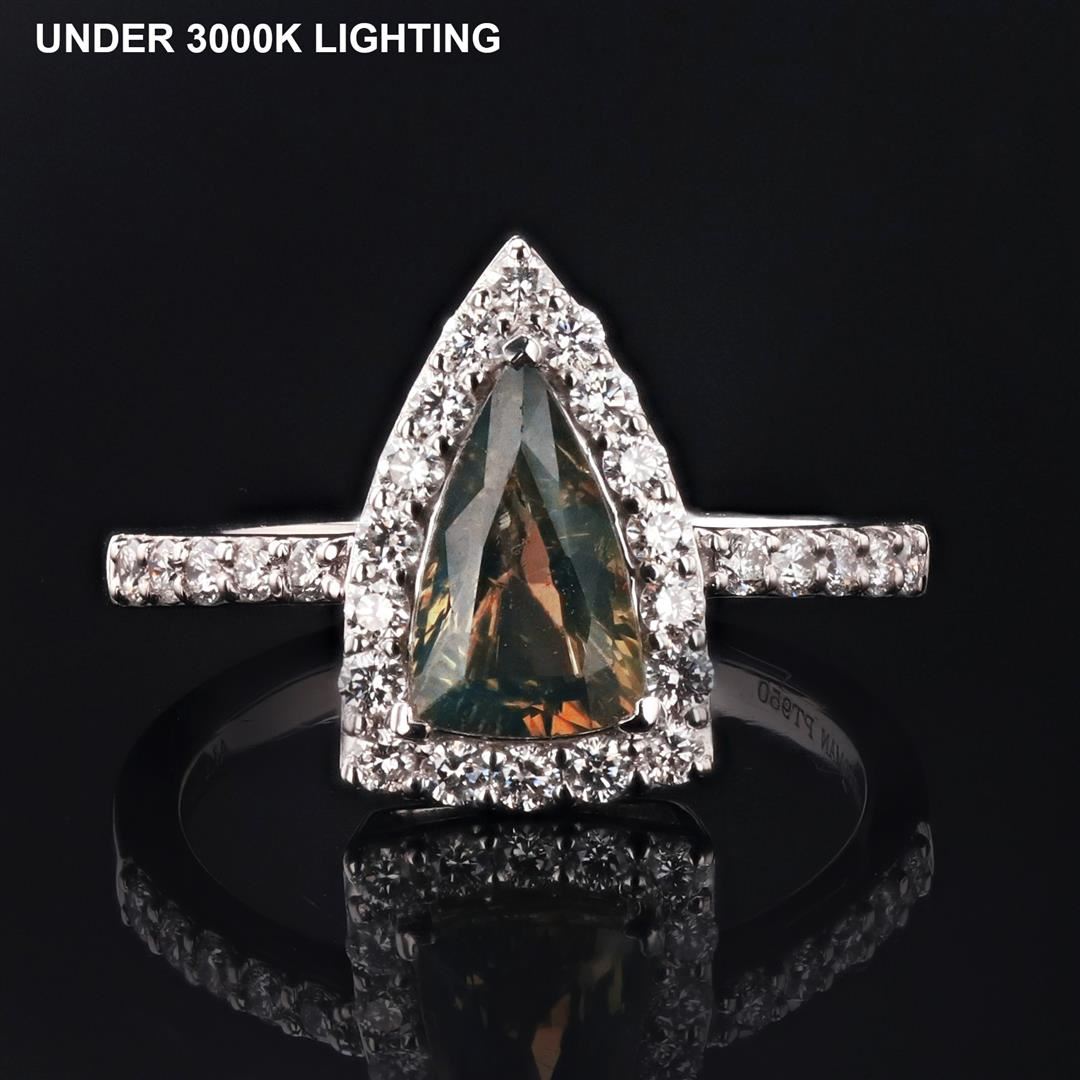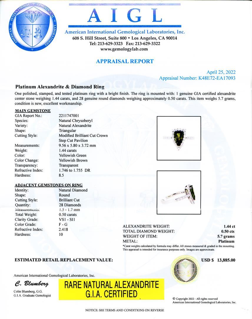One polished, stamped, and tested platinum ring with a bright finish. The ring is mounted with: 1 genuine GIA certified alexandrite center stone weighing 1.44 carats, and 28 genuine round diamonds weighing approximately 0.50 carats. This item weighs 5.7 g