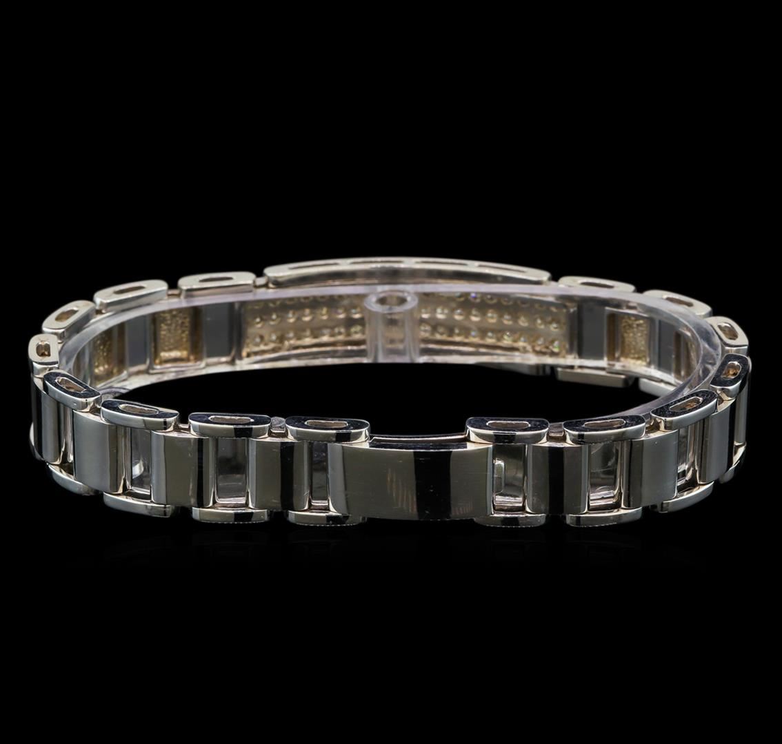 One electronically tested 14KT white gold cast & assembled diamond bracelet. Seven and one-half inch wearable length bracelet features a plate inlaid with three parallel diamond ribbons transitioning into white gold links, terminating in a fold over link clasp. Bright polish finish. Identified with markings of '14K'. Condition is good. Containing: Sixty-Three channel set round brilliant cut diamonds, measuring 1.80 - 1.80 x 1.08mm (depth est.) approximate total weight of 63 Stones = 1.44ct. Graded in the setting. Clarity SI-2 to I-2. Color: G - I. Total Weight of Diamonds 1.44ct.. Total Weight of Bracelet 40.64gm. AIG Appraised at $10,555.00.