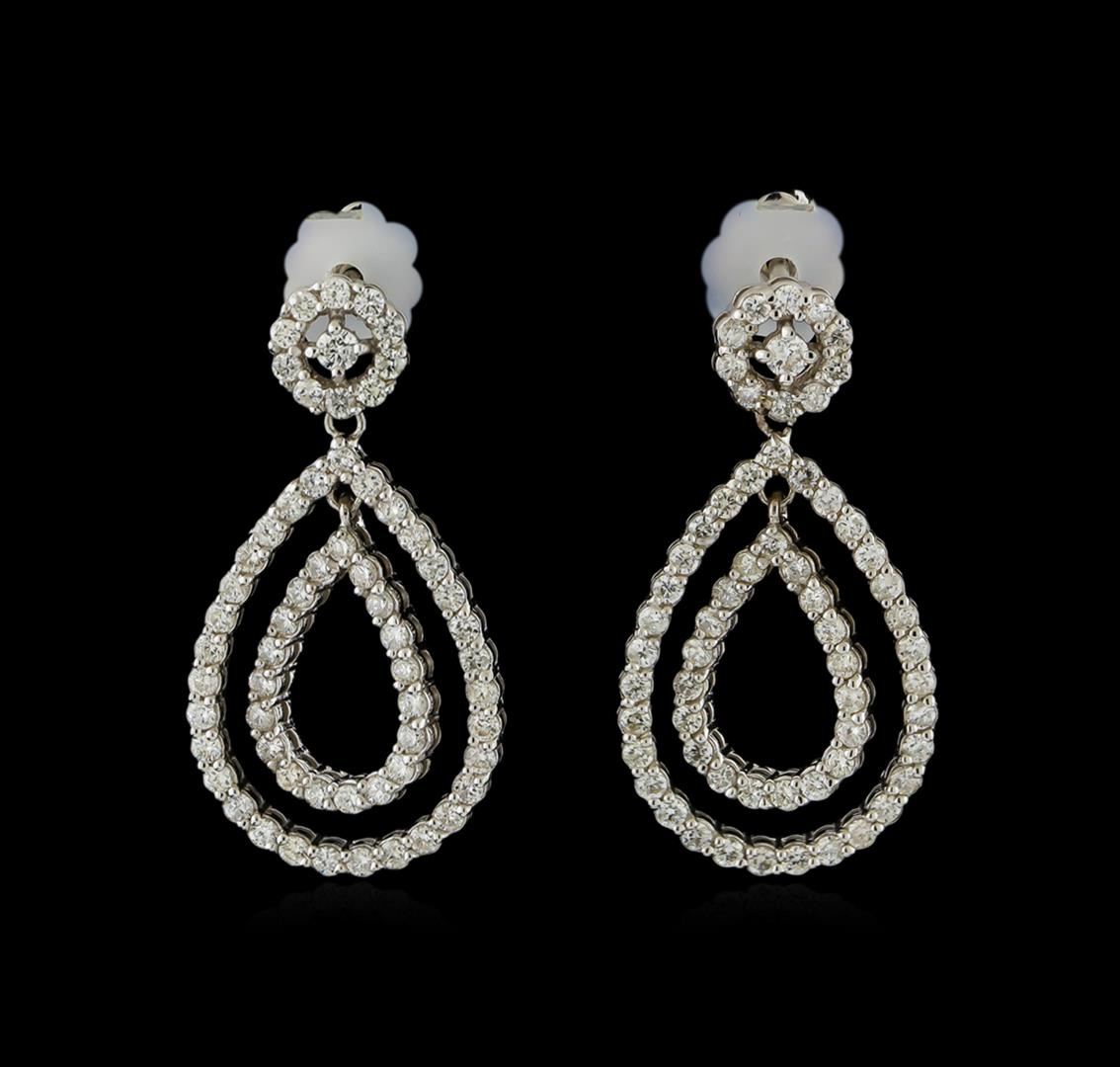 One pair electronically tested 14KT white gold lady's combination cast & assembled dangle double teardrop earrings with friction posts with a bright polish finish. Identified with markings of "14K". Condition is new, good workmanship. Containing: Two prong set round brilliant cut diamonds, measuring 2.20 - 2.15 x 1.35mm (depth est.) approximate total weight of 2 Stones = 0.08ct. Graded in the setting. Clarity: SI-1 to SI-2. Color: H - I. Cut Good One Hundred Twenty prong set round brilliant cut diamonds, measuring 1.50 - 1.40 x 0.88mm (depth est.) approximate total weight of 120 Stones = 1.36ct. Graded in the setting. Clarity: SI-1 to SI-2. Color: H - I. Cut Good. Total Weight of Diamonds 1.44ct. Total Weight of Earrings 5.70gm. GAS Appraised at $4,985.00.