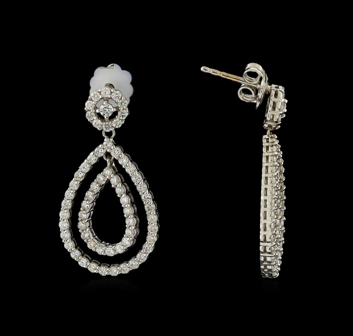 One pair electronically tested 14KT white gold lady's combination cast & assembled dangle double teardrop earrings with friction posts with a bright polish finish. Identified with markings of "14K". Condition is new, good workmanship. Containing: Two prong set round brilliant cut diamonds, measuring 2.20 - 2.15 x 1.35mm (depth est.) approximate total weight of 2 Stones = 0.08ct. Graded in the setting. Clarity: SI-1 to SI-2. Color: H - I. Cut Good One Hundred Twenty prong set round brilliant cut diamonds, measuring 1.50 - 1.40 x 0.88mm (depth est.) approximate total weight of 120 Stones = 1.36ct. Graded in the setting. Clarity: SI-1 to SI-2. Color: H - I. Cut Good. Total Weight of Diamonds 1.44ct. Total Weight of Earrings 5.70gm. GAS Appraised at $4,985.00.