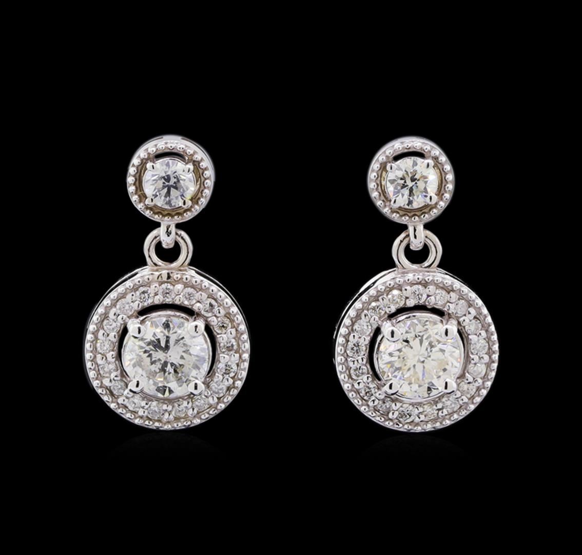 One pair electronically tested 14KT white gold lady's combination cast & assembled fashion earrings with heavy friction backs with a bright polish with milgrain detailing finish. The featured lady's earrings have a drop measuring 12 millimeters. Identified with markings of "14K". Condition is new, good workmanship. Containing: Two prong set round brilliant cut diamonds, measuring 5.00 - 4.85 x 3.18mm (depth est.) , 5.00.%. GTCF approximate total weight of 2 Stones = 1.02ct. Graded in the setting. Clarity: SI-1 to SI-2. Color: I - J. Cut Good Thirty-Four prong set round brilliant cut diamonds, measuring 1.20 - 1.10 x 0.71mm (depth est.) approximate total weight of 34 Stones = 0.20ct. Graded in the setting. Clarity: SI-1 to SI-2. Color: G - Good Two prong set round brilliant cut diamonds, measuring 3.00 - 2.95 x 1.94mm (depth est.) approximate total weight of 2 Stones = 0.22ct. Graded in the setting. Clarity: VS-2 to SI-1. Color: Very Good. Total Weight of Diamonds 1.44ct. Total Weight of Earrings 3.60gm. GAS Appraised at $8,495.00.