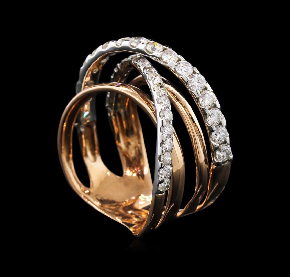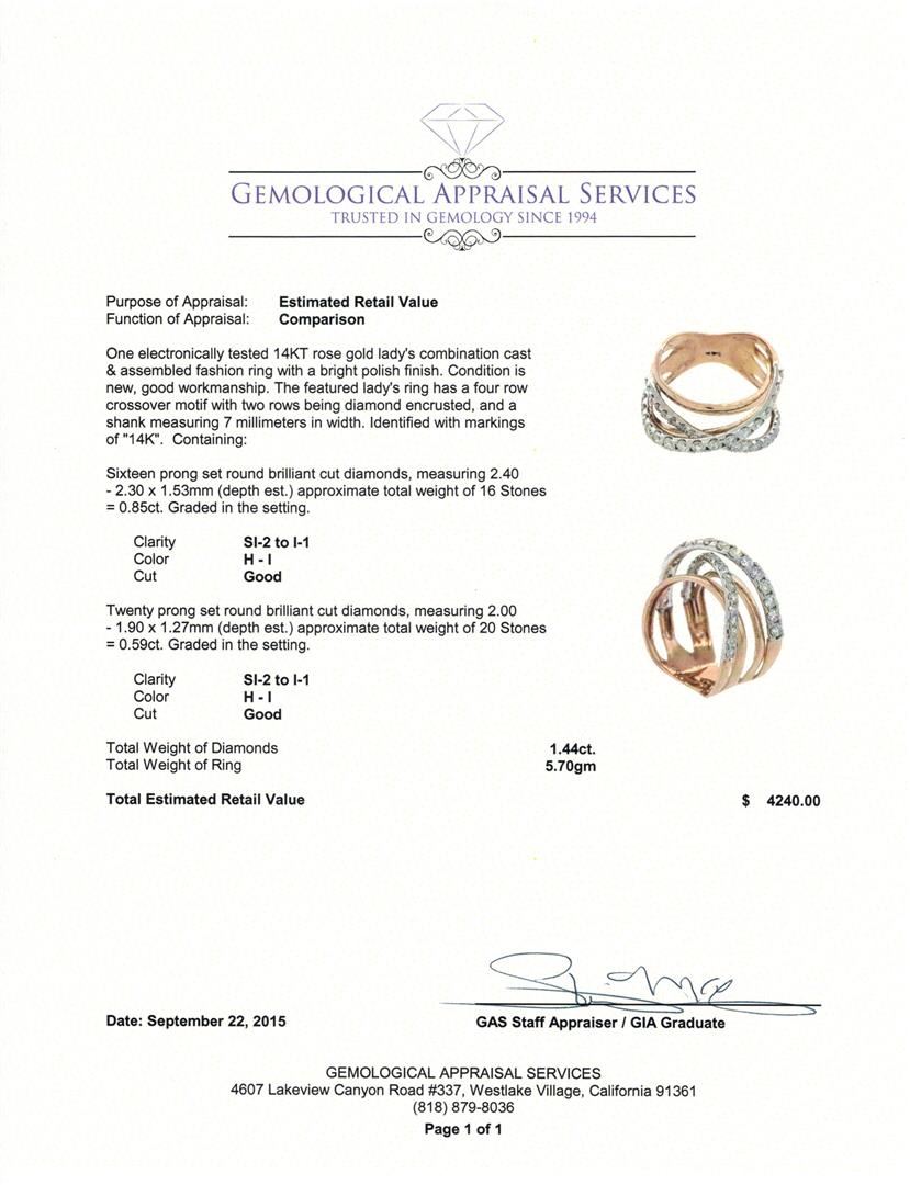 One electronically tested 14KT rose gold lady's combination cast & assembled fashion ring with a bright polish finish. The featured lady's ring has a four row crossover motif with two rows being diamond encrusted, and a shank measuring 7 millimeters in width. Identified with markings of "14K". Condition is new, good workmanship. Containing: Sixteen prong set round brilliant cut diamonds, measuring 2.40 - 2.30 x 1.53mm (depth est.) approximate total weight of 16 Stones = 0.85ct. Graded in the setting. Clarity: SI-2 to I-1. Color: H - I. Cut Good Twenty prong set round brilliant cut diamonds, measuring 2.00 - 1.90 x 1.27mm (depth est.) approximate total weight of 20 Stones = 0.59ct. Graded in the setting. Clarity: SI-2 to I-1. Color: H - I. Cut Good. Total Weight of Diamonds 1.44ct. Total Weight of Ring 5.70gm at $4240.00.. GAS Appraised at $4,240.00.