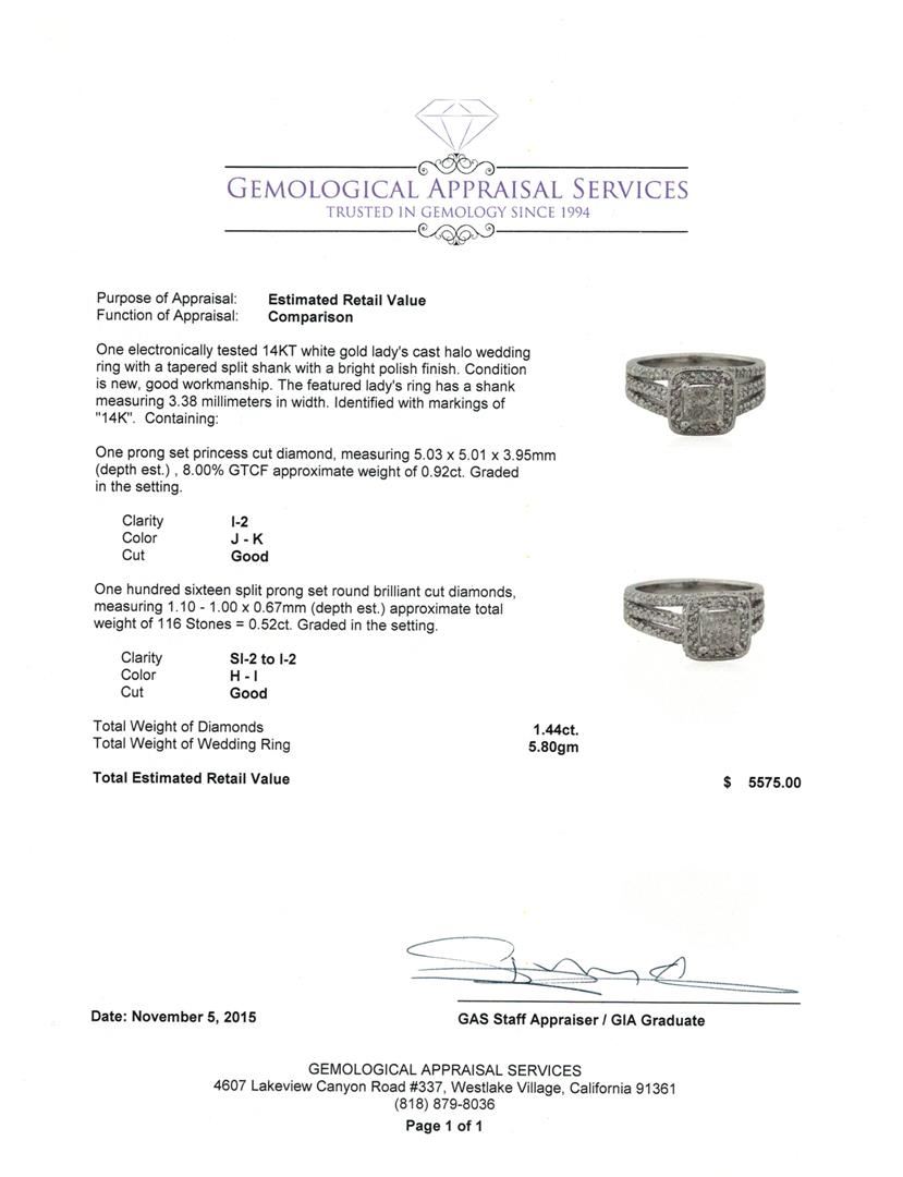 One electronically tested 14KT white gold lady's cast halo wedding ring with a tapered split shank with a bright polish finish. The featured lady's ring has a shank measuring 3.38 millimeters in width. Identified with markings of "14K". Condition is new, good workmanship. Containing: One prong set princess cut diamond, measuring 5.03 x 5.01 x 3.95mm (depth est.) , 8.00% GTCF approximate weight of 0.92ct. Graded in the setting. Clarity: I-2. Color: J - K. Cut Good One Hundred Sixteen split prong set round brilliant cut diamonds, measuring 1.10 - 1.00 x 0.67mm (depth est.) approximate total weight of 116 Stones = 0.52ct. Graded in the setting. Clarity: SI-2 to I-2. Color: H - I. Cut Good. Total Weight of Diamonds 1.44ct. Total Weight of Wedding Ring 5.80gm. GAS Appraised at $5,575.00.