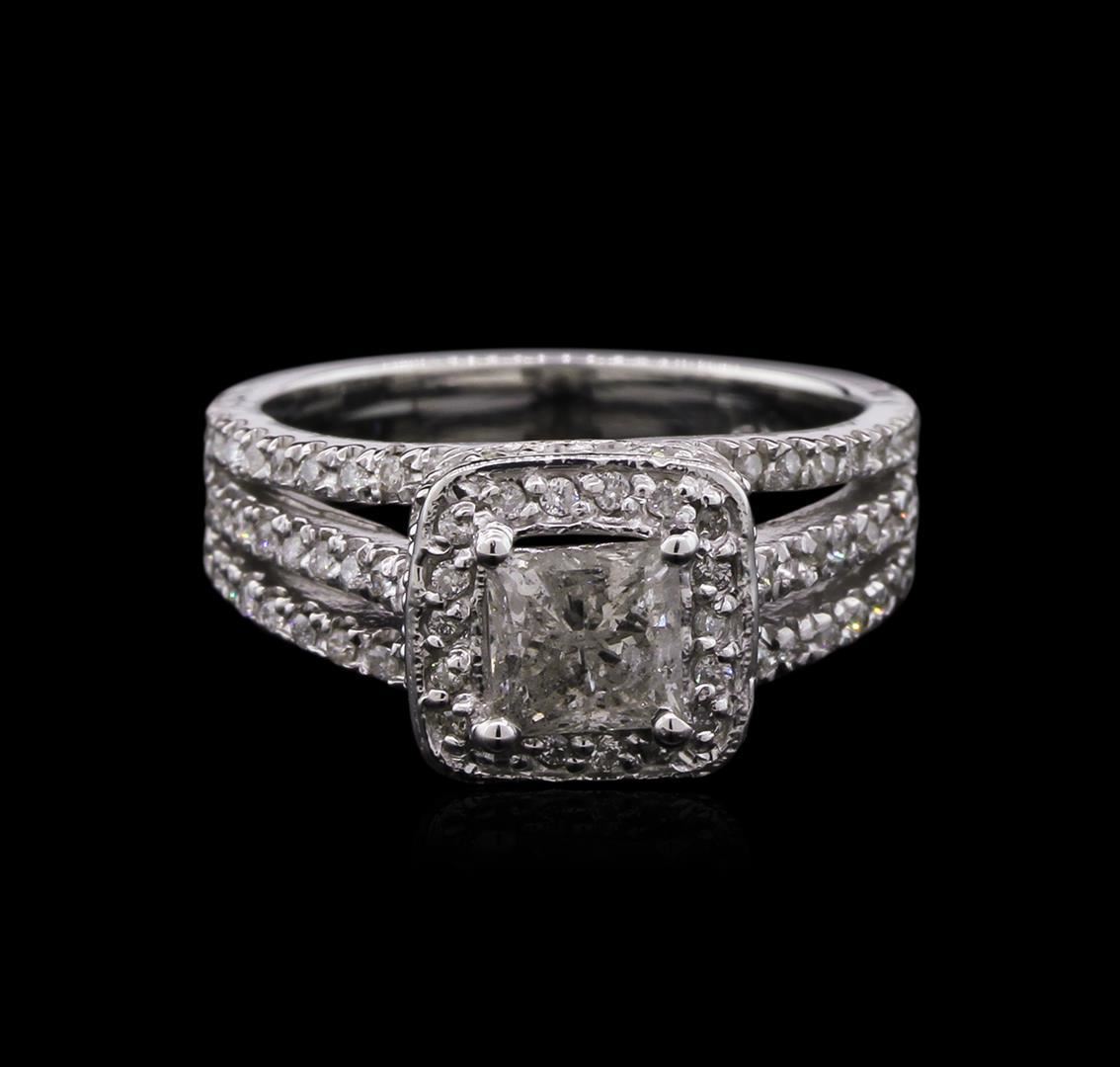 One electronically tested 14KT white gold lady's cast halo wedding ring with a tapered split shank with a bright polish finish. The featured lady's ring has a shank measuring 3.38 millimeters in width. Identified with markings of "14K". Condition is new, good workmanship. Containing: One prong set princess cut diamond, measuring 5.03 x 5.01 x 3.95mm (depth est.) , 8.00% GTCF approximate weight of 0.92ct. Graded in the setting. Clarity: I-2. Color: J - K. Cut Good One Hundred Sixteen split prong set round brilliant cut diamonds, measuring 1.10 - 1.00 x 0.67mm (depth est.) approximate total weight of 116 Stones = 0.52ct. Graded in the setting. Clarity: SI-2 to I-2. Color: H - I. Cut Good. Total Weight of Diamonds 1.44ct. Total Weight of Wedding Ring 5.80gm. GAS Appraised.