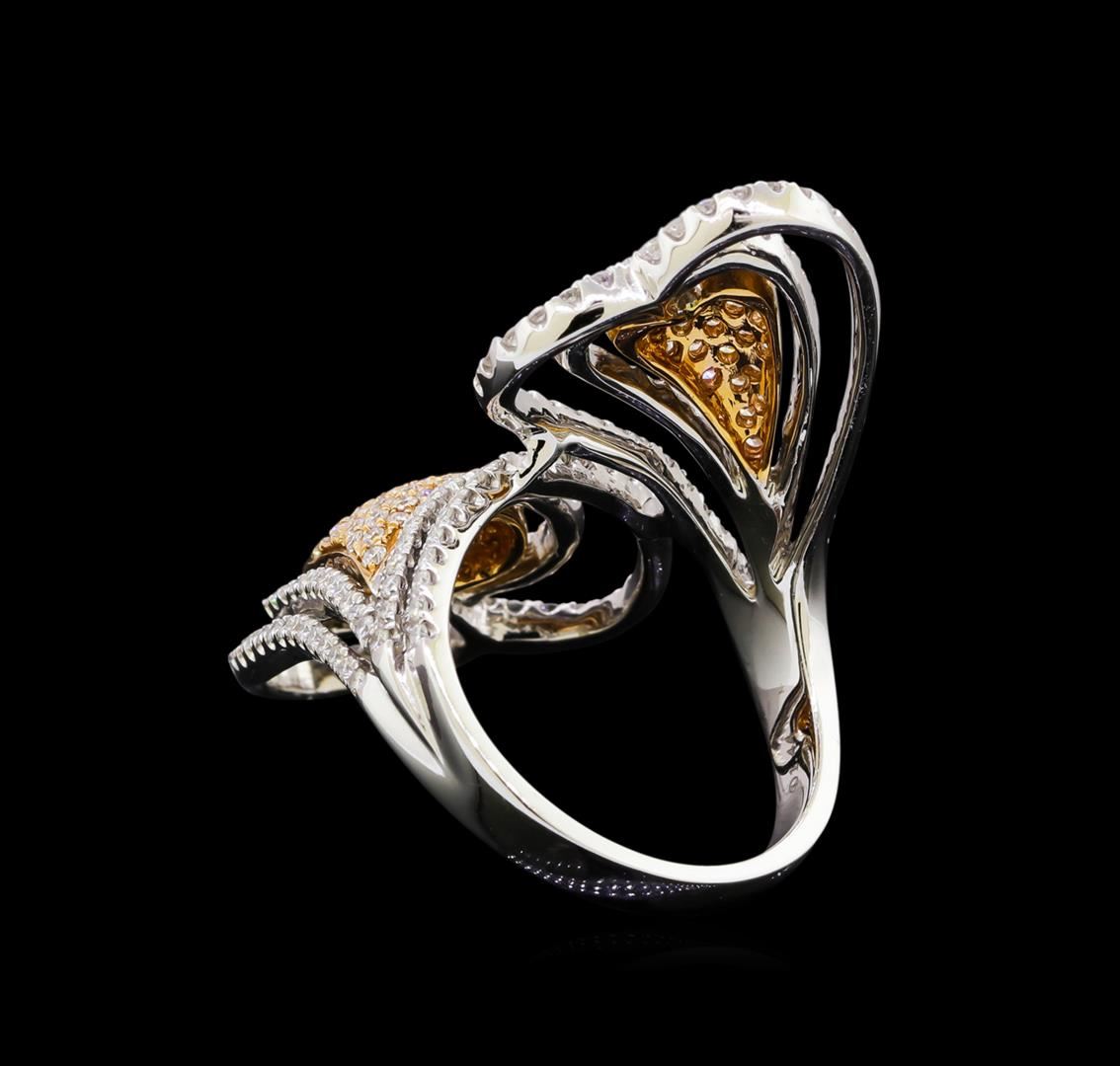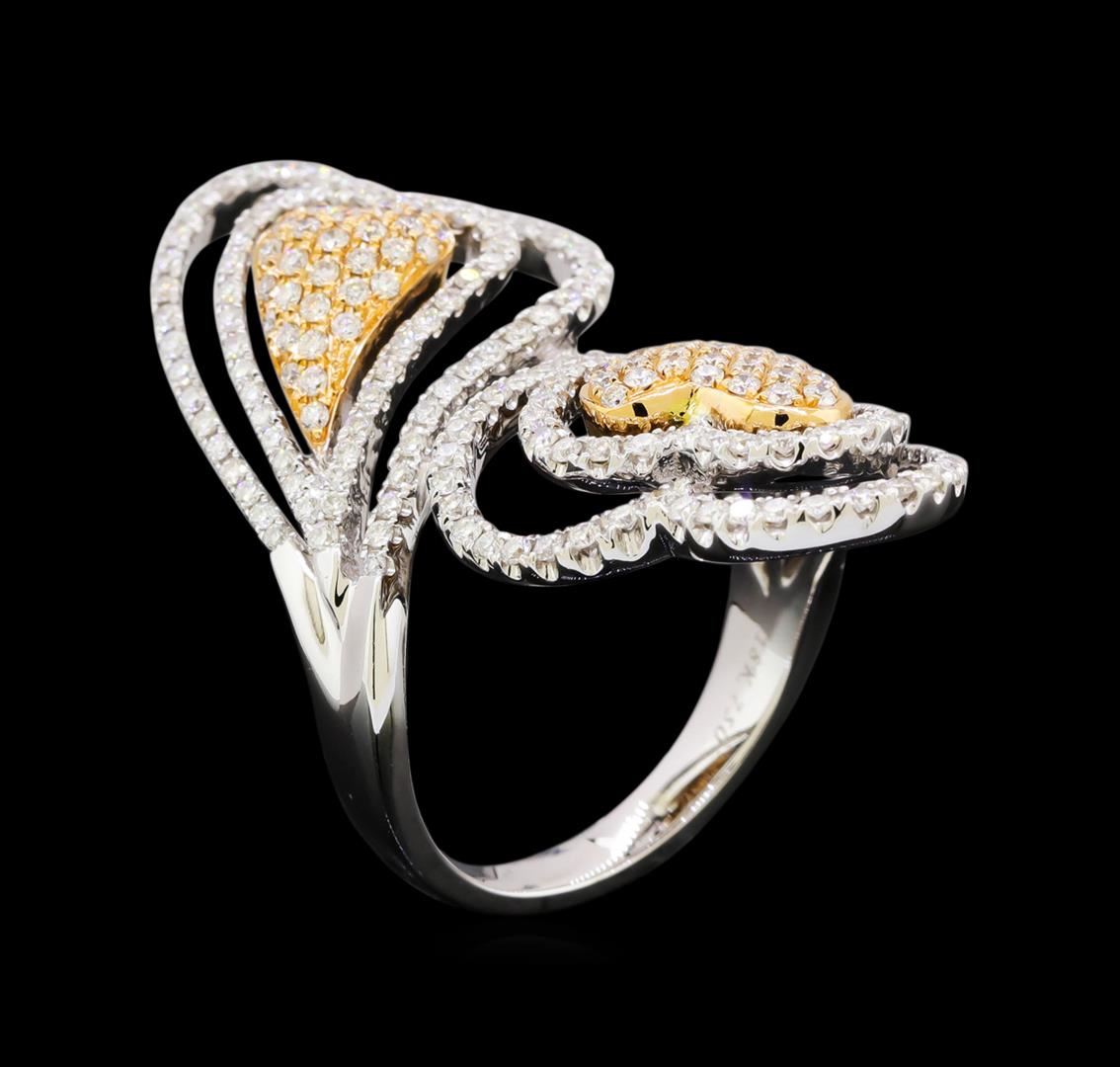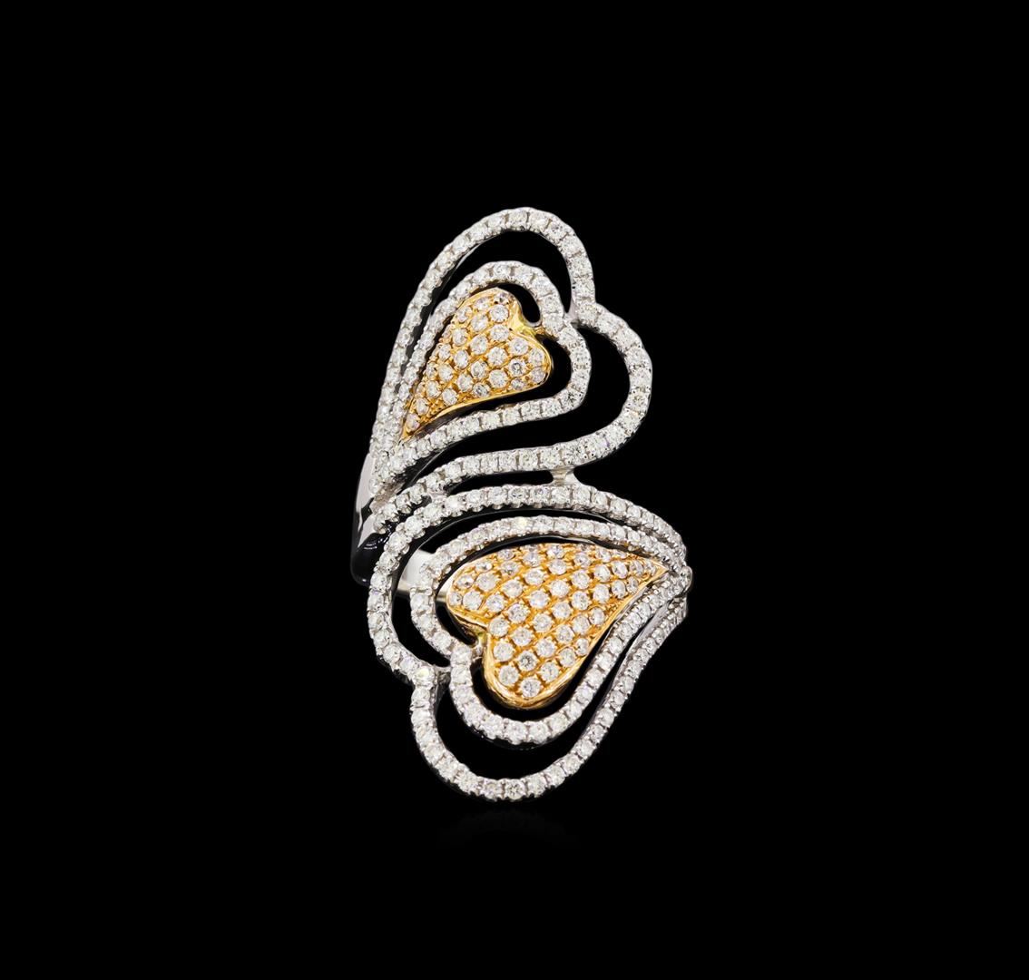 One electronically tested 18KT rose and white gold lady's combination cast & assembled fashion ring with a Double Bypassing Heart with a bright polish finish. The featured lady's ring has a shank measuring 2.84 millimeters in width. Identified with markings of "18K 750". Condition is new, good workmanship. Containing: Two Hundred Thirty-Eight prong set round brilliant cut diamonds, measuring 1.20 - 1.10 x 0.71mm (depth est.) approximate total weight of 238 Stones = 1.44ct. Graded in the setting. Clarity: VS-1 to SI-1. Color: G - Very Good. Total Weight of Diamonds 1.44ct. Total Weight of Ring 10.10gm. GAS Appraised at $8,345.00.