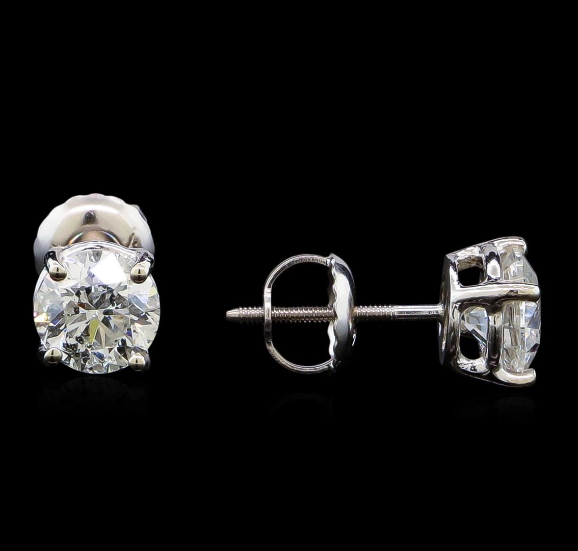 One pair electronically tested 14KT white gold lady's combination cast & assembled diamond stud earrings with threaded posts and screw-on/screw-off backs with a basket setting with a bright polish finish. Identified with markings of "14K". Condition is new, good workmanship. Containing: One prong set round brilliant cut diamond, measuring 5.71 - 5.68 x 3.72mm (depth est.) approximate weight of 0.74ct. Graded in the setting. Clarity: I-1. Color: G - Good One prong set round brilliant cut diamond, measuring 5.55 - 5.50 x 3.61mm (depth est.) , 3.00.%. GTCF approximate weight of 0.70ct. Graded in the setting. Clarity: I-1. Color: Good. Total Weight of Diamonds 1.44ct. Total Weight of Stud Earrings 1.10gm. GAS Appraised at $9,280.00.