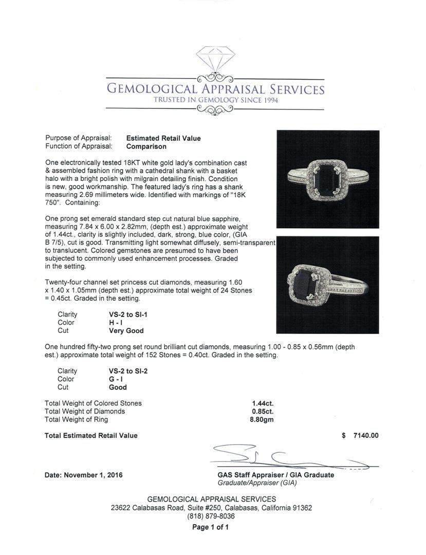 One electronically tested 18KT white gold lady's combination cast & assembled fashion ring with a cathedral shank with a basket halo with a bright polish with milgrain detailing finish. The featured lady's ring has a shank measuring 2.69 millimeters wide. Identified with markings of '18K 750'. Condition is new, good workmanship. Containing: One prong set emerald standard step cut natural blue sapphire, measuring 7.84 x 6.00 x 2.82mm, (depth est.) approximate weight of 1.44ct., clarity is slightly included, dark, strong, blue color, (GIA B 7/5), cut is good. Transmitting light somewhat diffusely, semi-transparent to translucent. Colored gemstones are presumed to have been subjected to commonly used enhancement processes. Graded in the setting. Twenty-Four channel set princess cut diamonds, measuring 1.60 x 1.40 x 1.05mm (depth est.) approximate total weight of 24 Stones = 0.45ct. Graded in the setting. Clarity VS-2 to SI-1. Color: H - I Cut Very Good One Hundred Fifty-Two prong set round brilliant cut diamonds, measuring 1.00 - 0.85 x 0.56mm (depth est.) approximate total weight of 152 Stones = 0.40ct. Graded in the setting. Clarity VS-2 to SI-2. Color: G - I Cut Good. Total Weight of Colored Stones 1.44ct.. Total Weight of Diamonds 0.85ct.. Total Weight of Ring 8.80gm. GAS Appraised at $7,140.00.