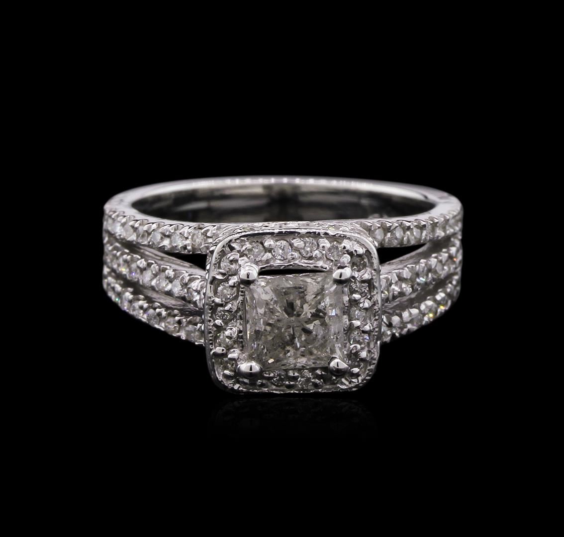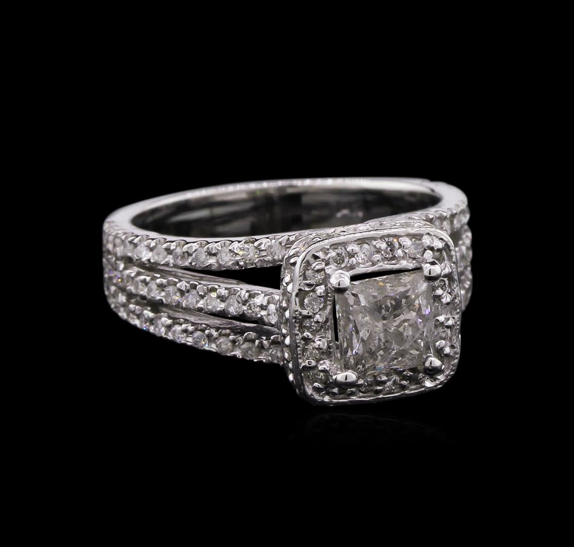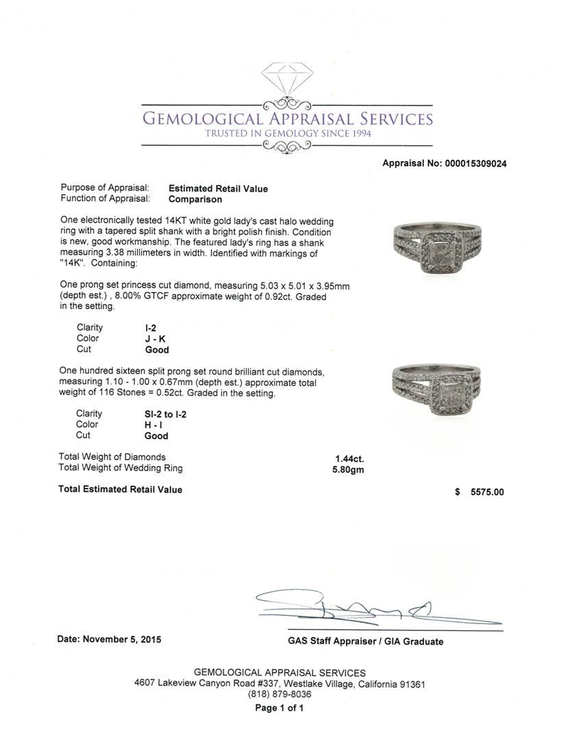 One electronically tested 14KT white gold lady's cast halo wedding ring with a tapered split shank with a bright polish finish. The featured lady's ring has a shank measuring 3.38 millimeters in width. Identified with markings of "14K". Condition is new, good workmanship. Containing: One prong set princess cut diamond, measuring 5.03 x 5.01 x 3.95mm (depth est.) , 8.00% GTCF approximate weight of 0.92ct. Graded in the setting. Clarity: I-2. Color: J - K. Cut Good One Hundred Sixteen split prong set round brilliant cut diamonds, measuring 1.10 - 1.00 x 0.67mm (depth est.) approximate total weight of 116 Stones = 0.52ct. Graded in the setting. Clarity: SI-2 to I-2. Color: H - I. Cut Good. Total Weight of Diamonds 1.44ct. Total Weight of Wedding Ring 5.80gm. GAS Appraised at $5,575.00.