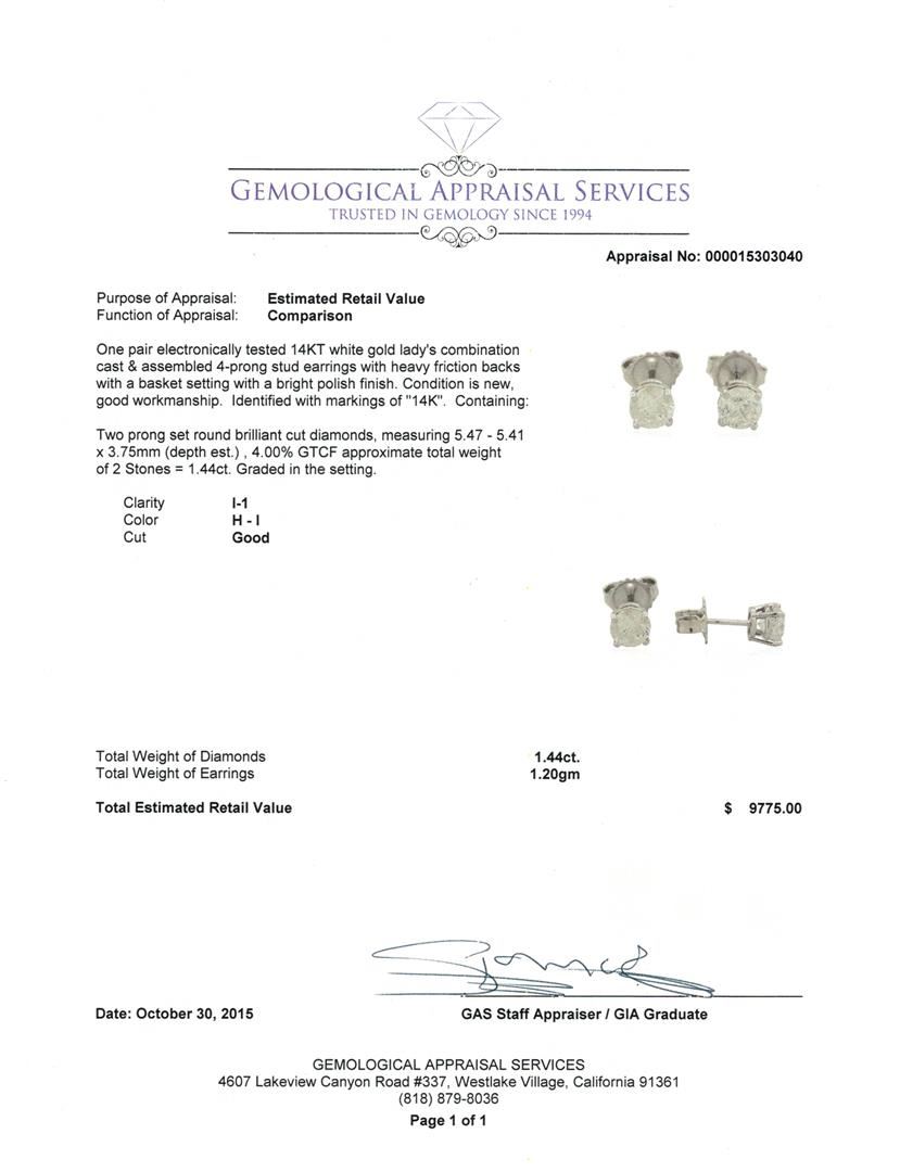 One pair electronically tested 14KT white gold lady's combination cast & assembled 4-prong stud earrings with heavy friction backs with a basket setting with a bright polish finish. Identified with markings of "14K". Condition is new, good workmanship. Containing: Two prong set round brilliant cut diamonds, measuring 5.47 - 5.41 x 3.75mm (depth est.) , 4.00% GTCF approximate total weight of 2 Stones = 1.44ct. Graded in the setting. Clarity: I-1. Color: H - I. Cut Good. Total Weight of Diamonds 1.44ct. Total Weight of Earrings 1.20gm. GAS Appraised.