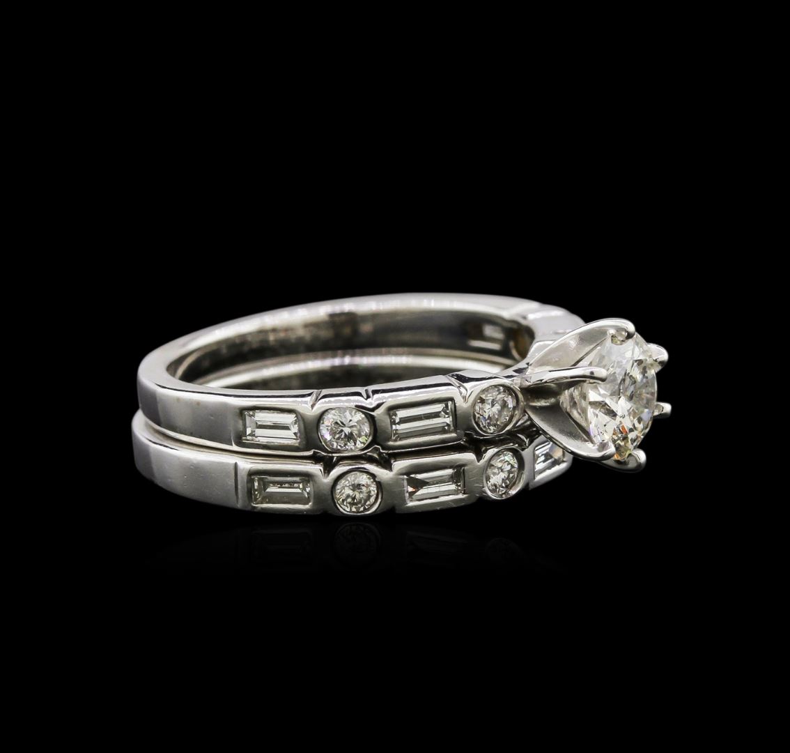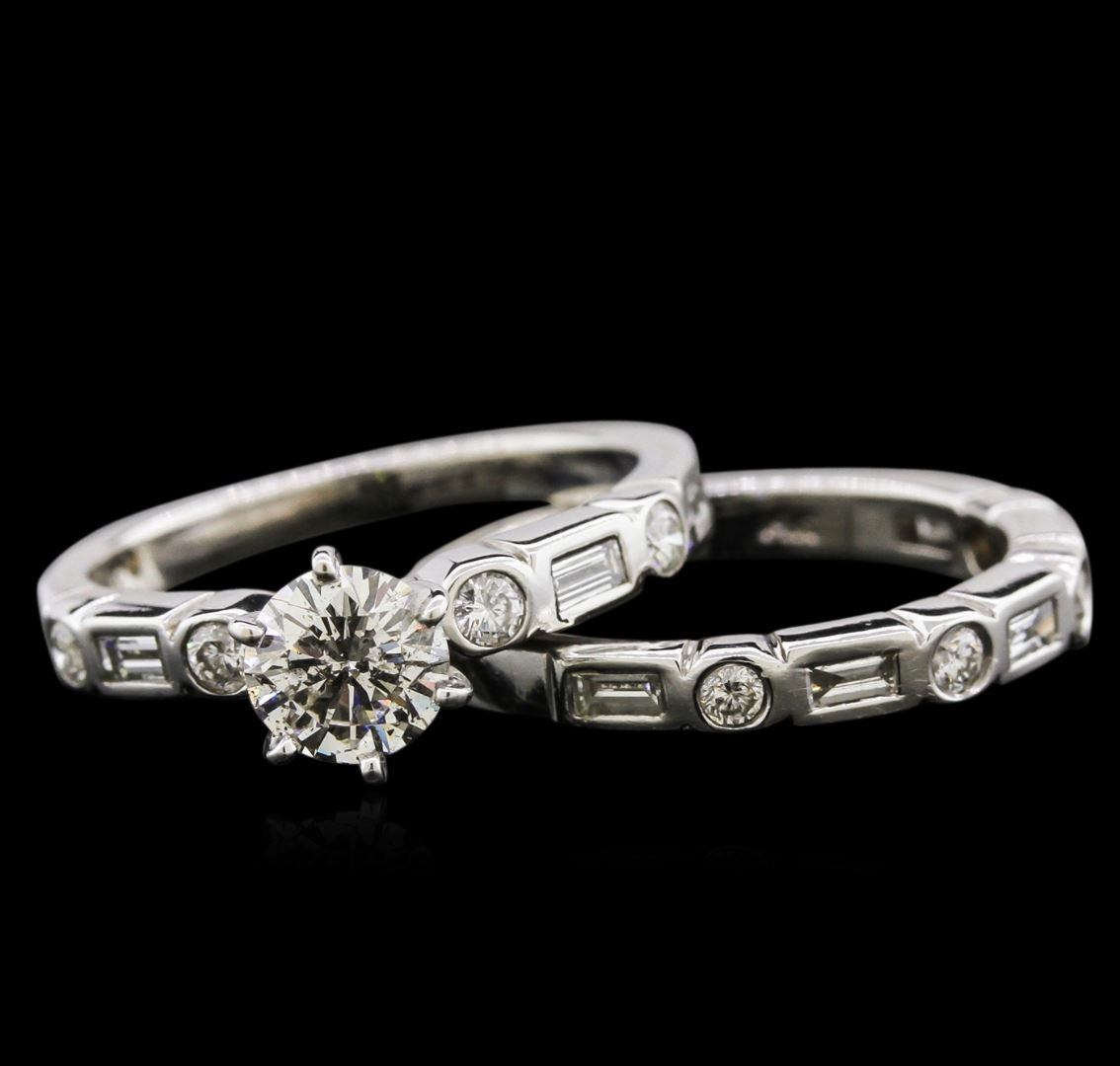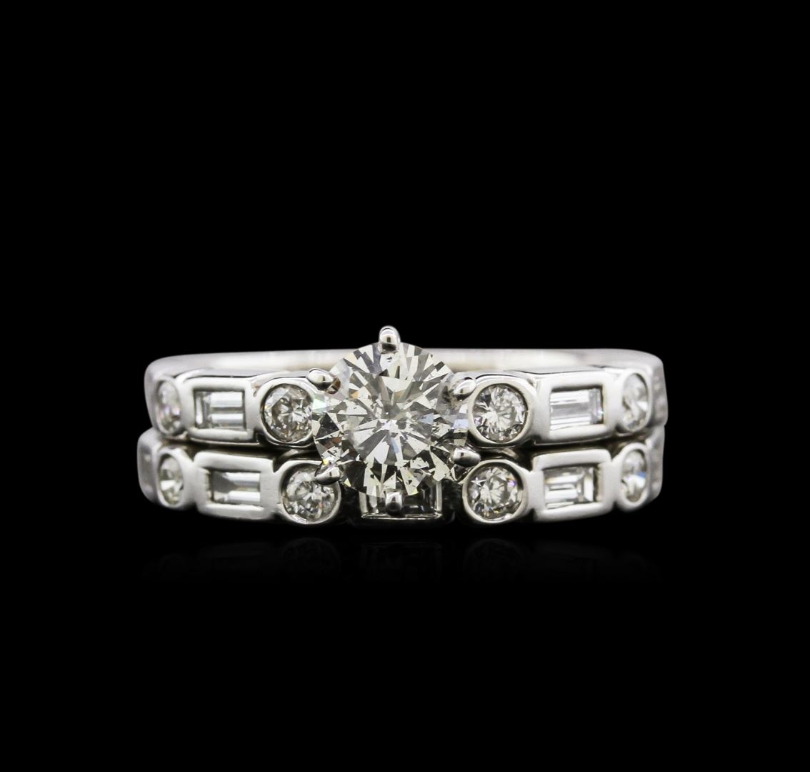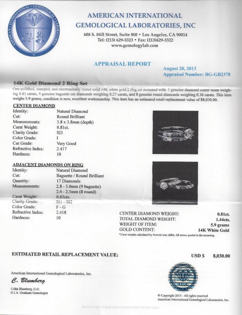 One polished, stamped, and electronically tested solid 14K white gold 2 ring set mounted with: 1 genuine diamond center stone weighing 0.81 carats, 9 genuine baguette cut diamonds weighing 0.27 carats, and 8 genuine round diamonds weighing 0.36 carats. This item weighs 5.9 grams, condition is new, excellent workmanship. This item has an estimated retail replacement value of $8,030.00. CENTER DIAMOND: Identity: Natural Diamond. Cut: Round Brilliant. Measurements: 5.8 x 3.8mm (depth). Carat Weight: 0.81ct. Clarity Grade: SI3. Color Grade: I. Cut Grade: Very Good. Refractive Index: 2.417. Hardness: 10. ADJACENT DIAMONDS ON RING: Identity: Natural Diamond. Cut: Baguette / Round Brilliant. Quantity: 17 Diamonds. Measurements: 2.8 - 3.0mm (9 baguette) 2.4 - 2.5mm (8 round). Carat Weight: 0.63cts. Clarity Grade: SI1 - SI2. Color Grade: F - G. Refractive Index: 2.418. Hardness: 10. Center Diamond Weight: 0.81ct. Total Diamond Weight: 1.44cts. Weight of Item: 5.9 grams. Gold Content: 14K White Gold. AIGL Appraised at $8,030.00.