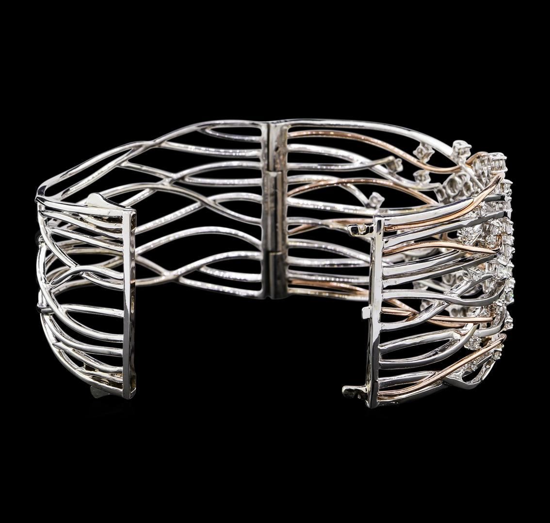 One electronically tested 14KT rose and white gold lady's combination cast & assembled fashion bangle bracelet with a double plunger clasp with a bright polish finish. The featured lady's bracelet has a freeform wave motif and measures approximately 7.5 inches in length. Identified with markings of 'K14'. Condition is new, good workmanship. Containing: Five prong set round brilliant cut diamonds, measuring 3.50 - 3.40 x 2.07mm (depth est.) approximate total weight of 5 Stones = 0.75ct. Graded in the setting. Clarity SI-1 to I-1. Color: H - I Cut Good Seven prong set round brilliant cut diamonds, measuring 3.00 - 2.95 x 1.85mm (depth est.) approximate total weight of 7 Stones = 0.70 ct. Graded in the setting. Clarity SI-1 to SI-2. Color: H - I Cut Good Eleven prong set round brilliant cut diamonds, measuring 2.75 - 2.65 x 1.67mm (depth est.) approximate total weight of 11 Stones = 0.82ct. Graded in the setting. Clarity SI-1 to I-1. Color: H - I Cut Good Fifteen prong set round brilliant cut diamonds, measuring 2.50 - 2.35 x 1.48mm (depth est.) approximate total weight of 15 Stones = 0.80 ct. Graded in the setting. Clarity SI-1 to SI-2. Color: H - I Cut Good Nine prong set round brilliant cut diamonds, measuring 2.10 - 2.00 x 1.27mm (depth est.) approximate total weight of 9 Stones = 0.30 ct. Graded in the setting. Clarity SI-1 to SI-2. Color: H - I Cut Good Sixteen prong set round brilliant cut diamonds, measuring 1.85 - 1.75 x 1.12mm (depth est.) approximate total weight of 16 Stones = 0.36ct. Graded in the setting. Clarity SI-1 to I-1. Color: H - I Cut Good. Total Weight of Diamonds 3.73ct.. Total Weight of Bangle Bracelet 51.70gm. GAS Appraised.