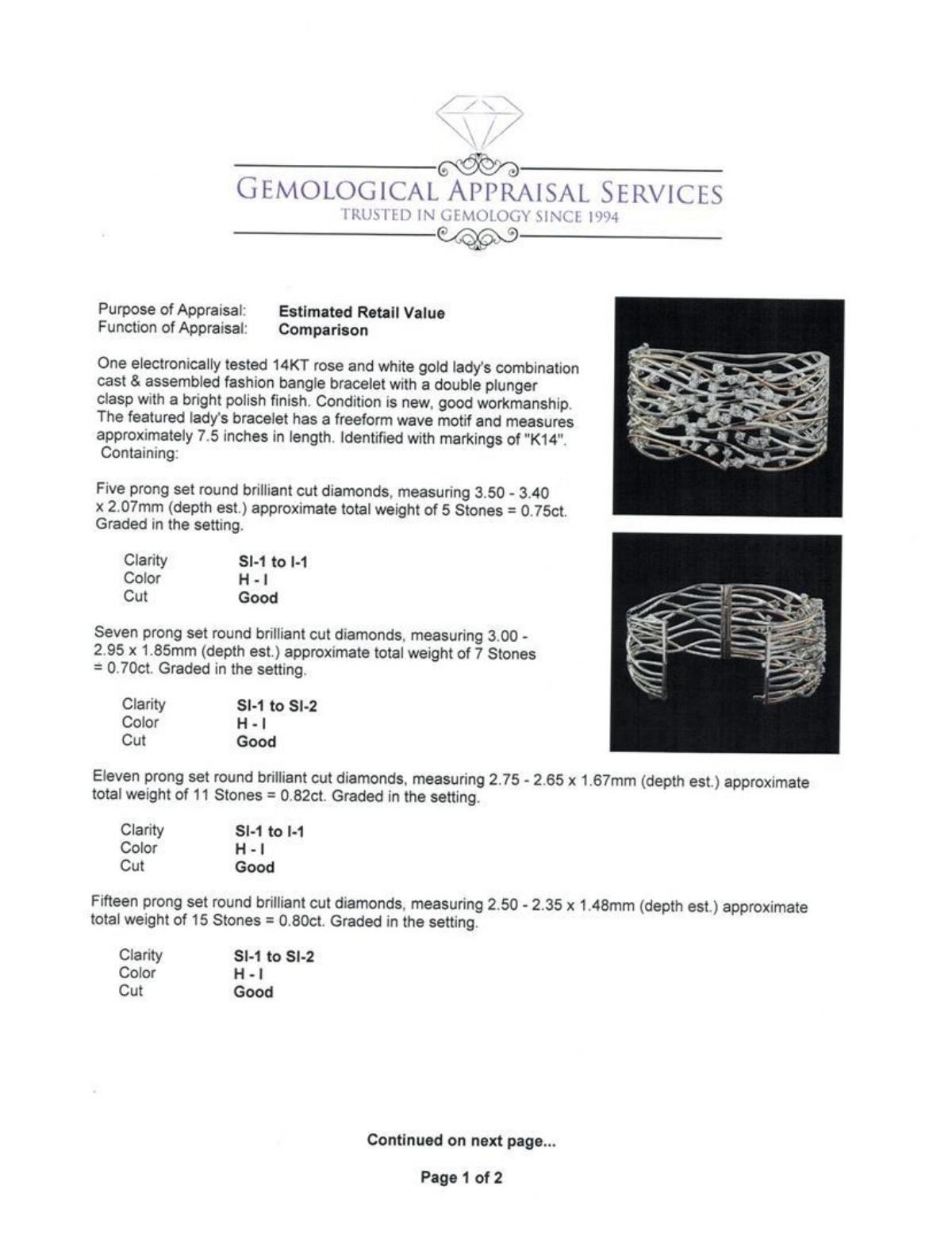 One electronically tested 14KT rose and white gold lady's combination cast & assembled fashion bangle bracelet with a double plunger clasp with a bright polish finish. The featured lady's bracelet has a freeform wave motif and measures approximately 7.5 inches in length. Identified with markings of 'K14'. Condition is new, good workmanship. Containing: Five prong set round brilliant cut diamonds, measuring 3.50 - 3.40 x 2.07mm (depth est.) approximate total weight of 5 Stones = 0.75ct. Graded in the setting. Clarity SI-1 to I-1. Color: H - I Cut Good Seven prong set round brilliant cut diamonds, measuring 3.00 - 2.95 x 1.85mm (depth est.) approximate total weight of 7 Stones = 0.70 ct. Graded in the setting. Clarity SI-1 to SI-2. Color: H - I Cut Good Eleven prong set round brilliant cut diamonds, measuring 2.75 - 2.65 x 1.67mm (depth est.) approximate total weight of 11 Stones = 0.82ct. Graded in the setting. Clarity SI-1 to I-1. Color: H - I Cut Good Fifteen prong set round brilliant cut diamonds, measuring 2.50 - 2.35 x 1.48mm (depth est.) approximate total weight of 15 Stones = 0.80 ct. Graded in the setting. Clarity SI-1 to SI-2. Color: H - I Cut Good Nine prong set round brilliant cut diamonds, measuring 2.10 - 2.00 x 1.27mm (depth est.) approximate total weight of 9 Stones = 0.30 ct. Graded in the setting. Clarity SI-1 to SI-2. Color: H - I Cut Good Sixteen prong set round brilliant cut diamonds, measuring 1.85 - 1.75 x 1.12mm (depth est.) approximate total weight of 16 Stones = 0.36ct. Graded in the setting. Clarity SI-1 to I-1. Color: H - I Cut Good. Total Weight of Diamonds 3.73ct.. Total Weight of Bangle Bracelet 51.70gm. GAS Appraised.
