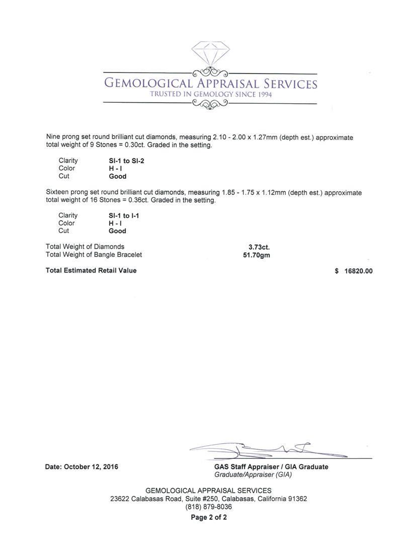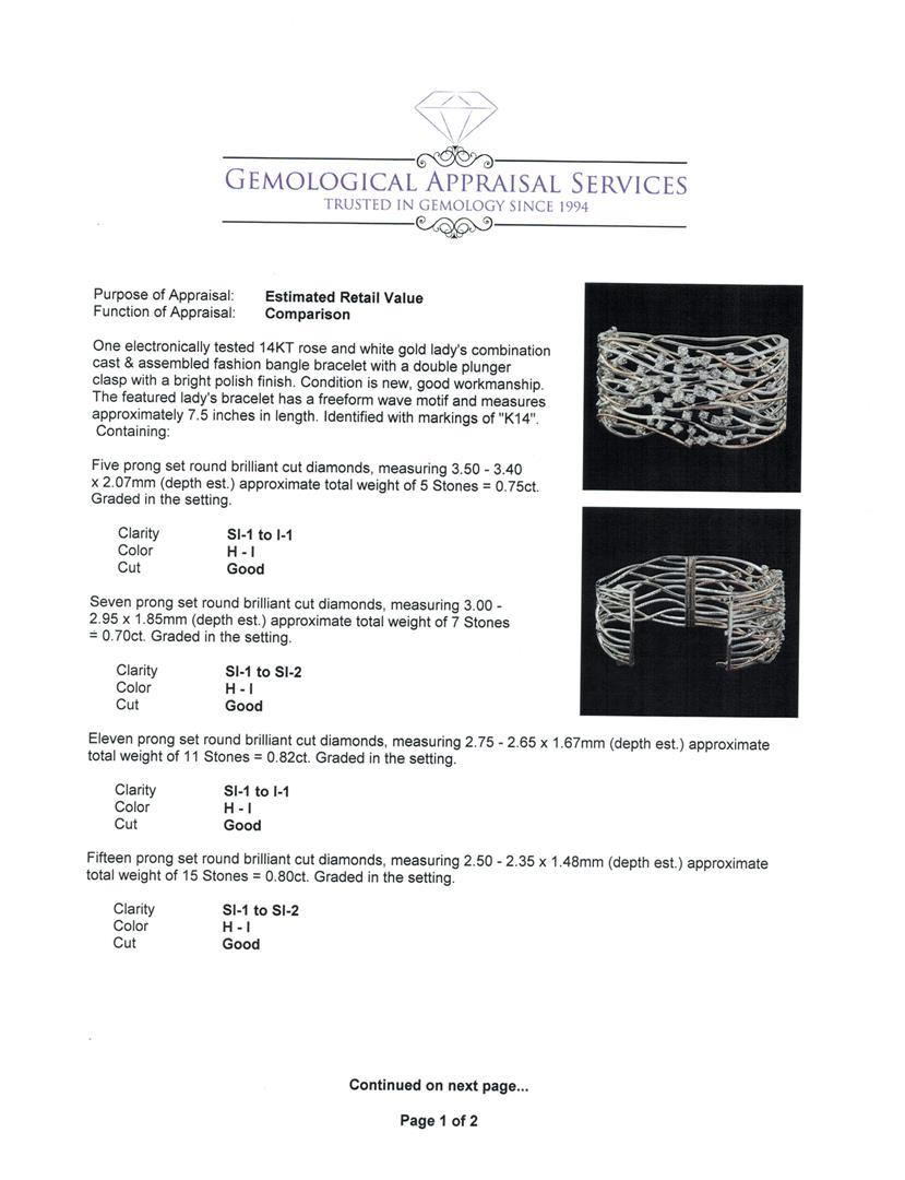 One electronically tested 14KT rose and white gold lady's combination cast & assembled fashion bangle bracelet with a double plunger clasp with a bright polish finish. The featured lady's bracelet has a freeform wave motif and measures approximately 7.5 inches in length. Identified with markings of 'K14'. Condition is new, good workmanship. Containing: Five prong set round brilliant cut diamonds, measuring 3.50 - 3.40 x 2.07mm (depth est.) approximate total weight of 5 Stones = 0.75ct. Graded in the setting. Clarity SI-1 to I-1. Color: H - I Cut Good Seven prong set round brilliant cut diamonds, measuring 3.00 - 2.95 x 1.85mm (depth est.) approximate total weight of 7 Stones = 0.70 ct. Graded in the setting. Clarity SI-1 to SI-2. Color: H - I Cut Good Eleven prong set round brilliant cut diamonds, measuring 2.75 - 2.65 x 1.67mm (depth est.) approximate total weight of 11 Stones = 0.82ct. Graded in the setting. Clarity SI-1 to I-1. Color: H - I Cut Good Fifteen prong set round brilliant cut diamonds, measuring 2.50 - 2.35 x 1.48mm (depth est.) approximate total weight of 15 Stones = 0.80 ct. Graded in the setting. Clarity SI-1 to SI-2. Color: H - I Cut Good Nine prong set round brilliant cut diamonds, measuring 2.10 - 2.00 x 1.27mm (depth est.) approximate total weight of 9 Stones = 0.30 ct. Graded in the setting. Clarity SI-1 to SI-2. Color: H - I Cut Good Sixteen prong set round brilliant cut diamonds, measuring 1.85 - 1.75 x 1.12mm (depth est.) approximate total weight of 16 Stones = 0.36ct. Graded in the setting. Clarity SI-1 to I-1. Color: H - I Cut Good. Total Weight of Diamonds 3.73ct.. Total Weight of Bangle Bracelet 51.70gm. GAS Appraised.