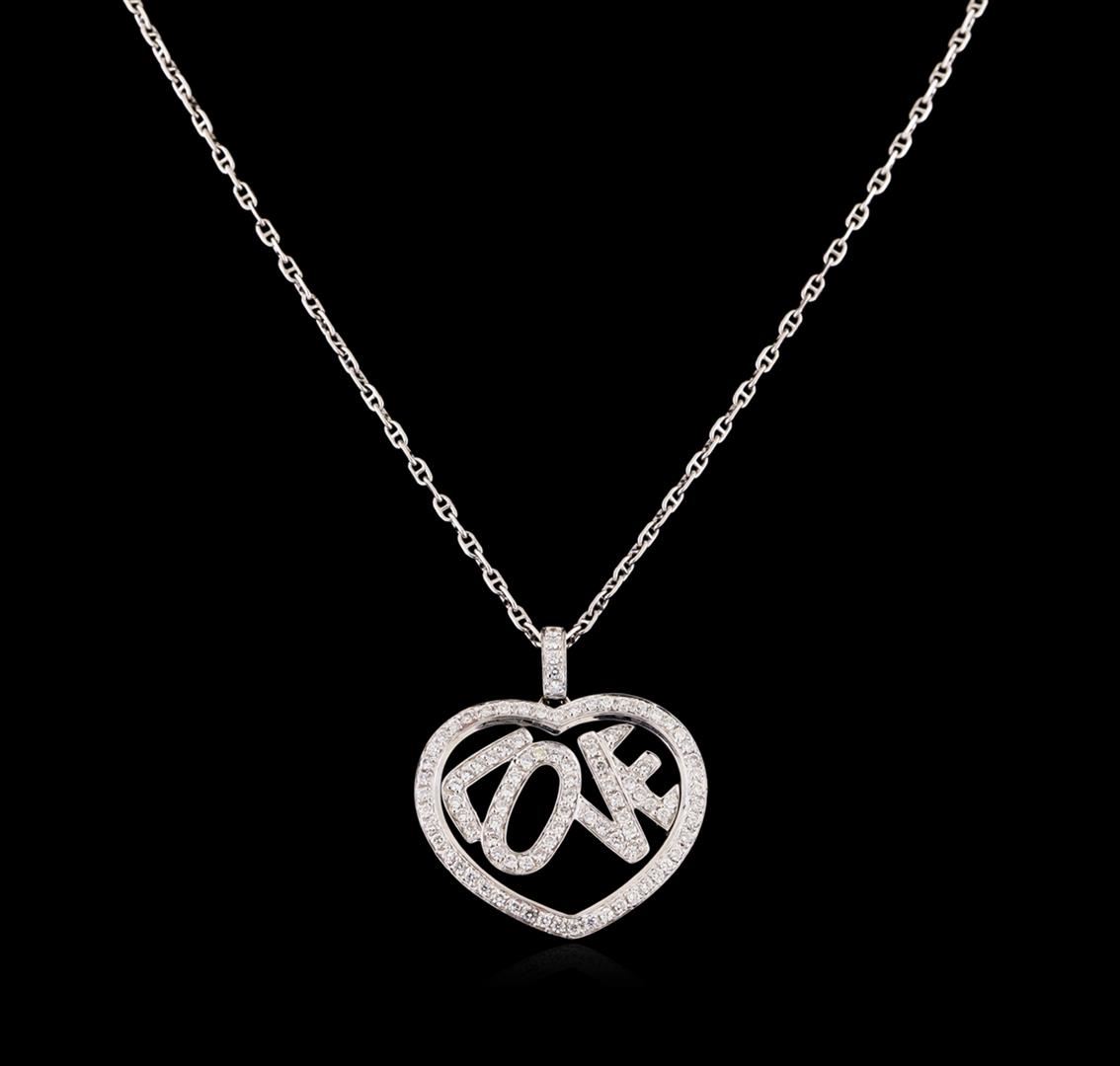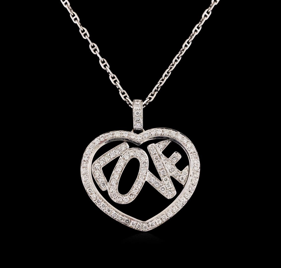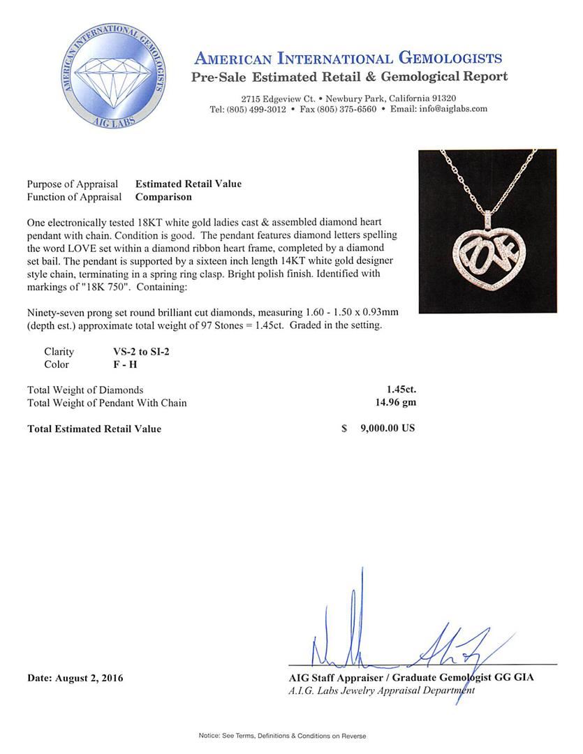 One electronically tested 18KT white gold ladies cast & assembled diamond heart pendant with chain. The pendant features diamond letters spelling the word LOVE set within a diamond ribbon heart frame, completed by a diamond set bail. The pendant is supported by a sixteen inch length 14KT white gold designer style chain, terminating in a spring ring clasp. Bright polish finish. Identified with markings of '18K 750'. Condition is good. Containing: Ninety-Seven prong set round brilliant cut diamonds, measuring 1.60 - 1.50 x 0.93mm (depth est.) approximate total weight of 97 Stones = 1.45ct. Graded in the setting. Clarity VS-2 to SI-2. Color: F - H. Total Weight of Diamonds 1.45ct.. Total Weight of Pendant With Chain 14.96gm. AIG Appraised at $9,000.00.