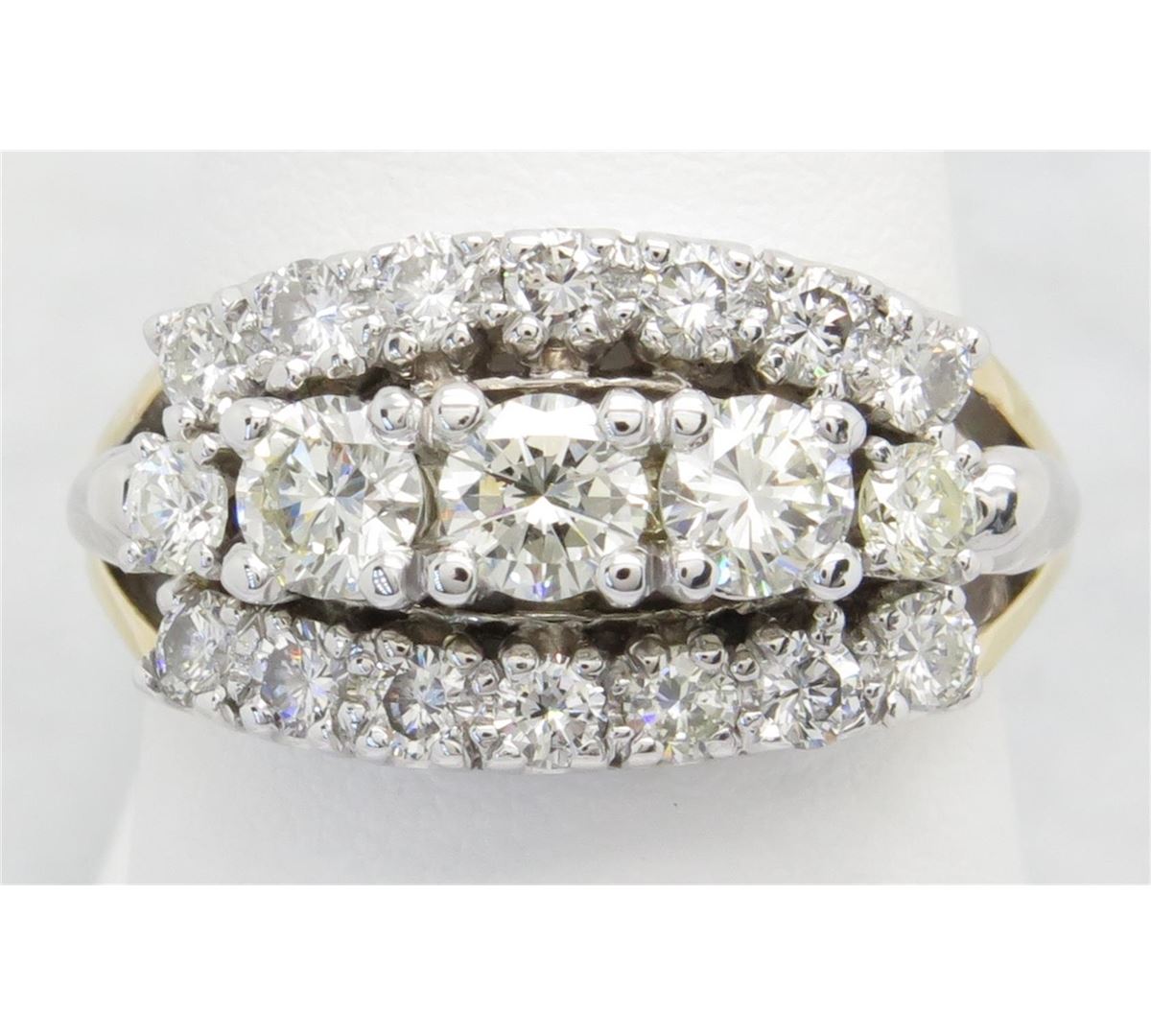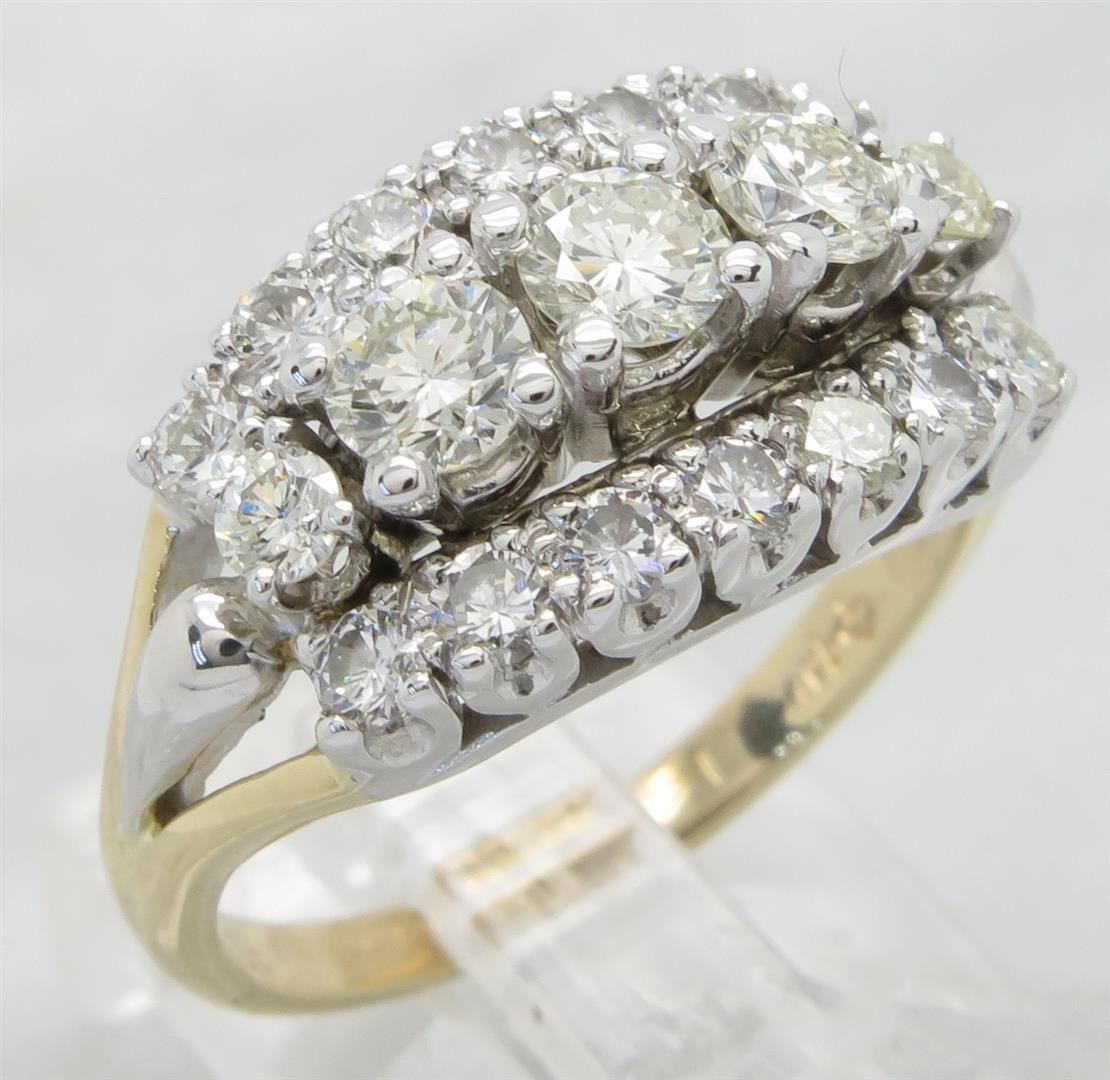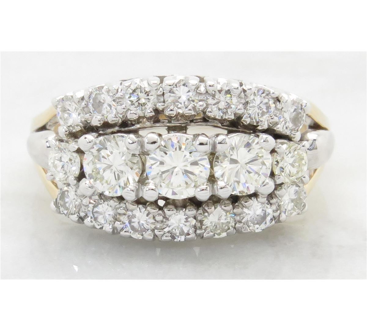 One tested 14K gold diamond ring. Containing: One Round Brilliant Cut Diamond. Approximate size: .23CT, Clarity: SI, Color: H-I. 18 round brilliant cut diamonds. Approximate total diamond weight: 1.45CTW. Diamonds are graded in the mounting, unless otherwise stated. Weight: 5.9 grams, Size: 7.0.