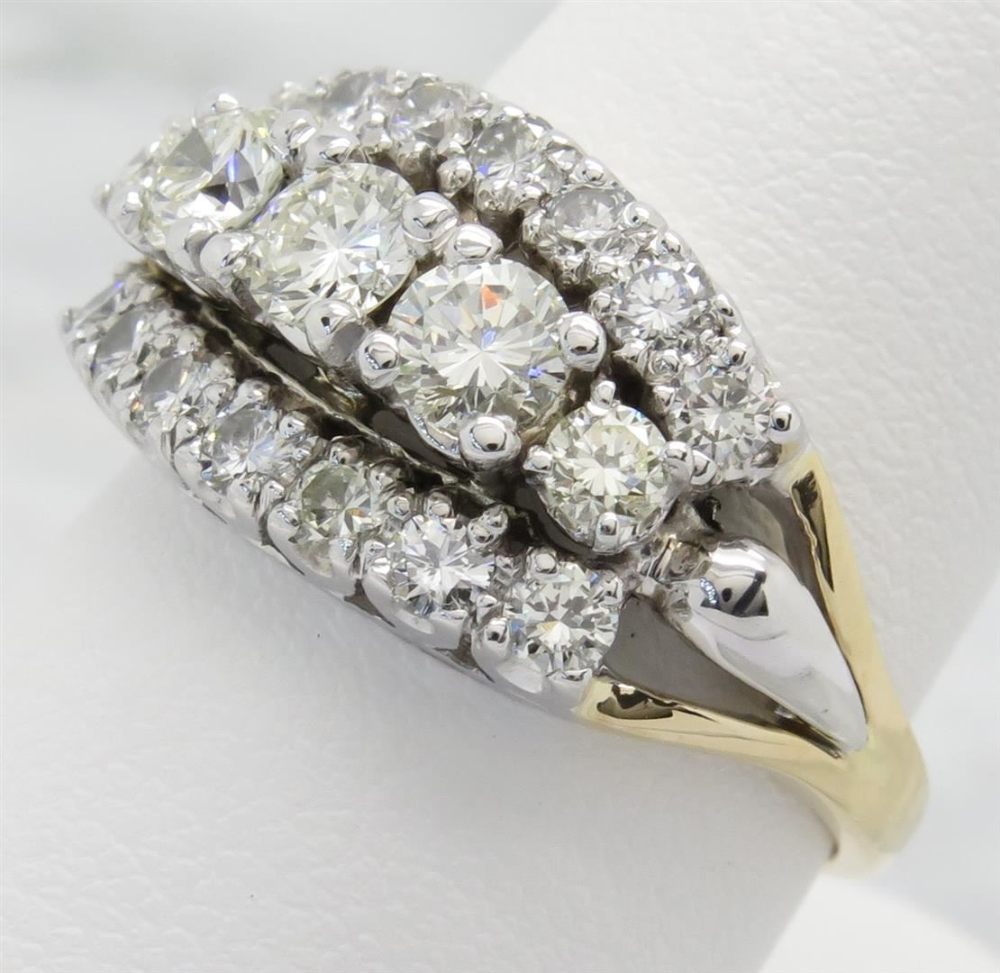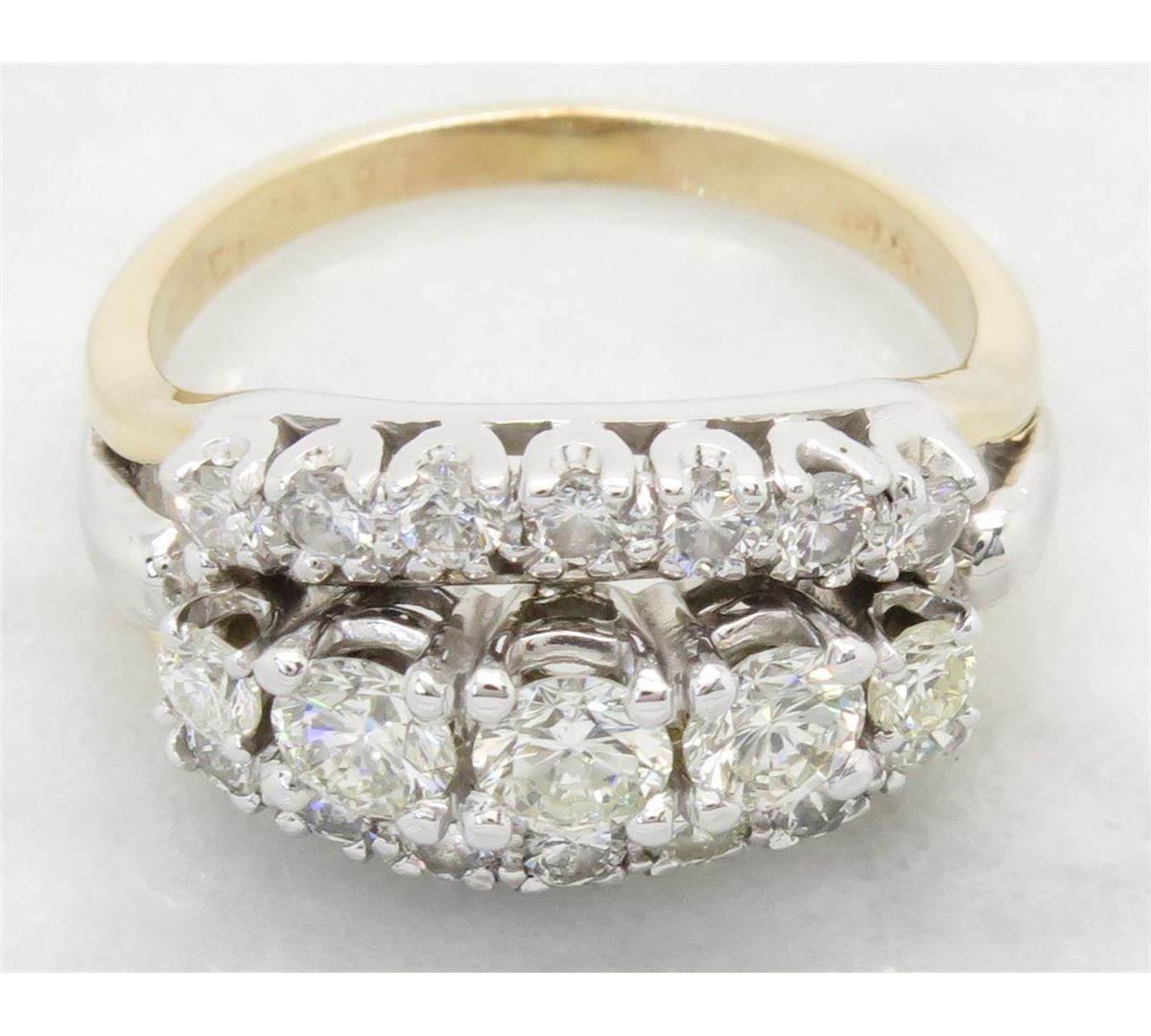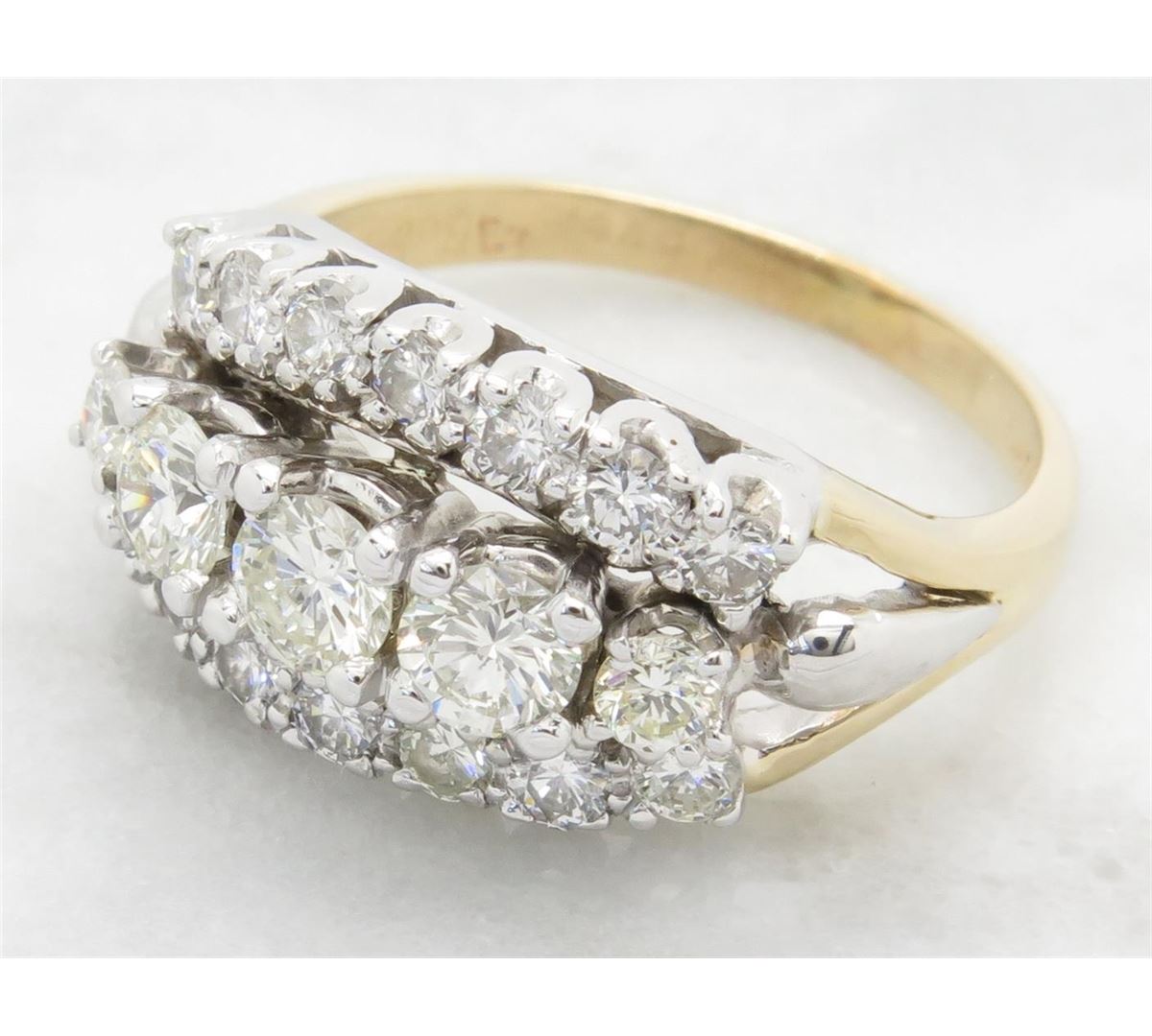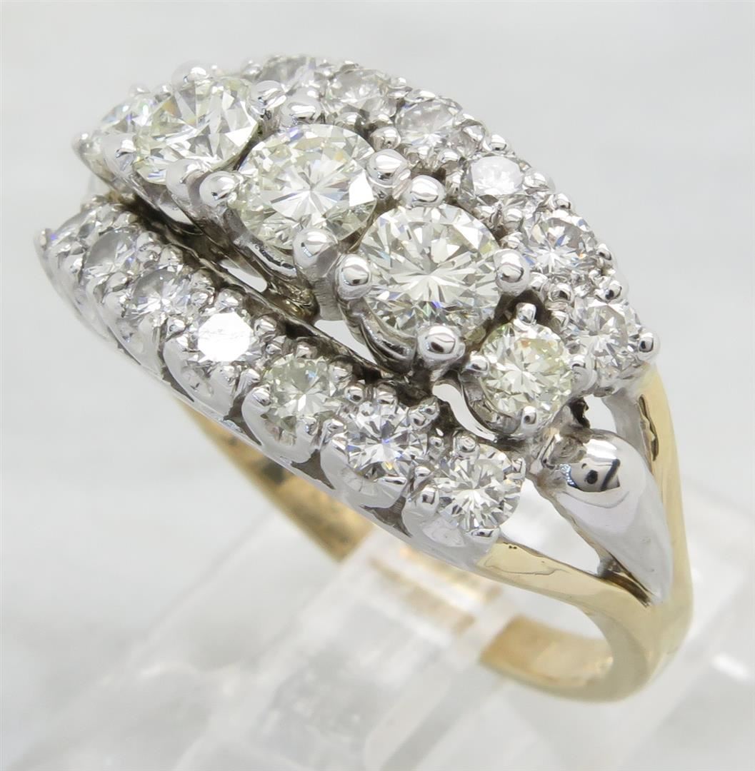 One tested 14K gold diamond ring. Containing: One Round Brilliant Cut Diamond. Approximate size: .23CT, Clarity: SI, Color: H-I. 18 round brilliant cut diamonds. Approximate total diamond weight: 1.45CTW. Diamonds are graded in the mounting, unless otherwise stated. Weight: 5.9 grams, Size: 7.0.