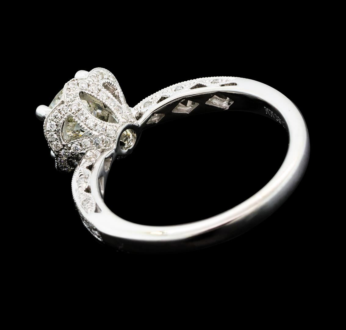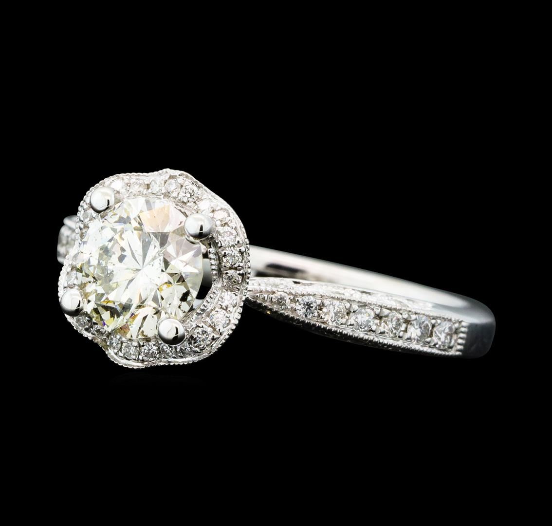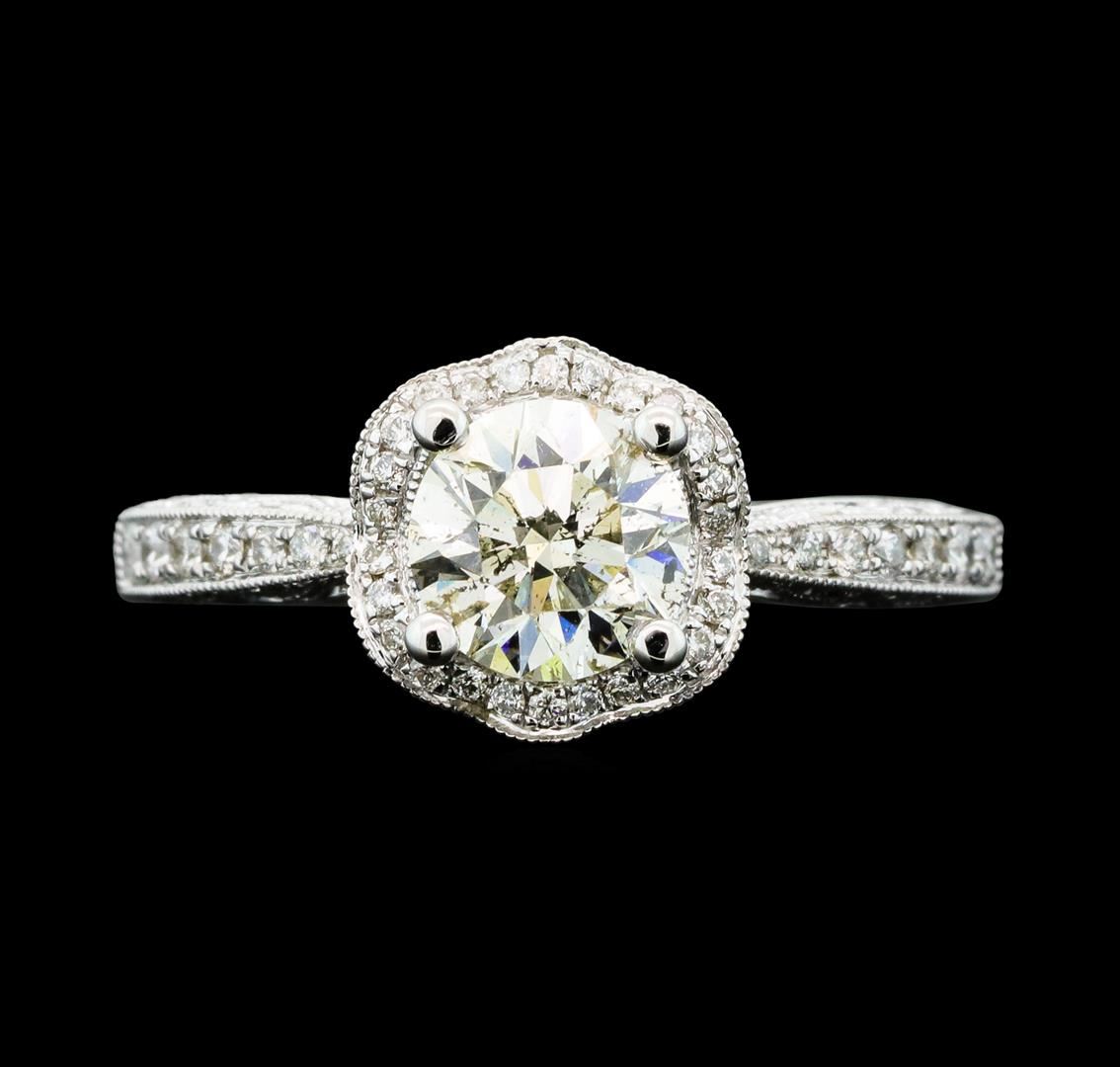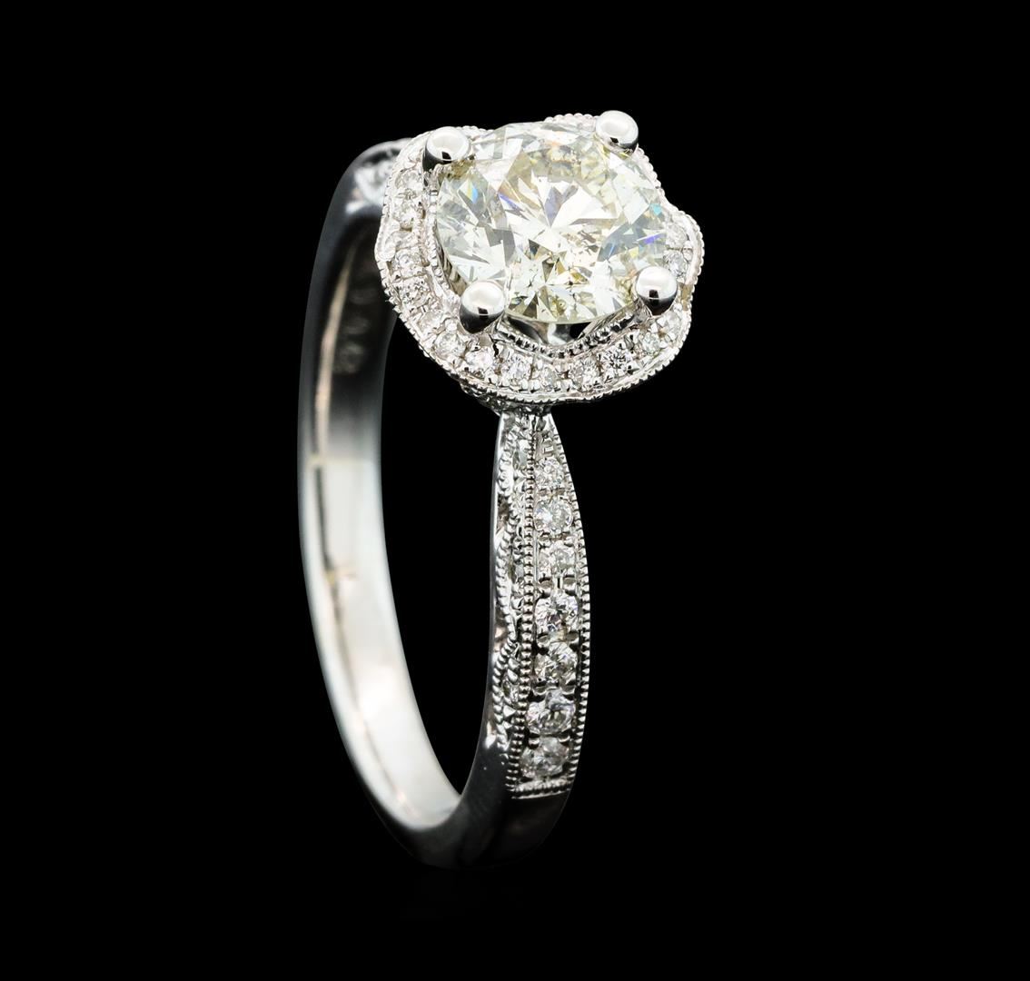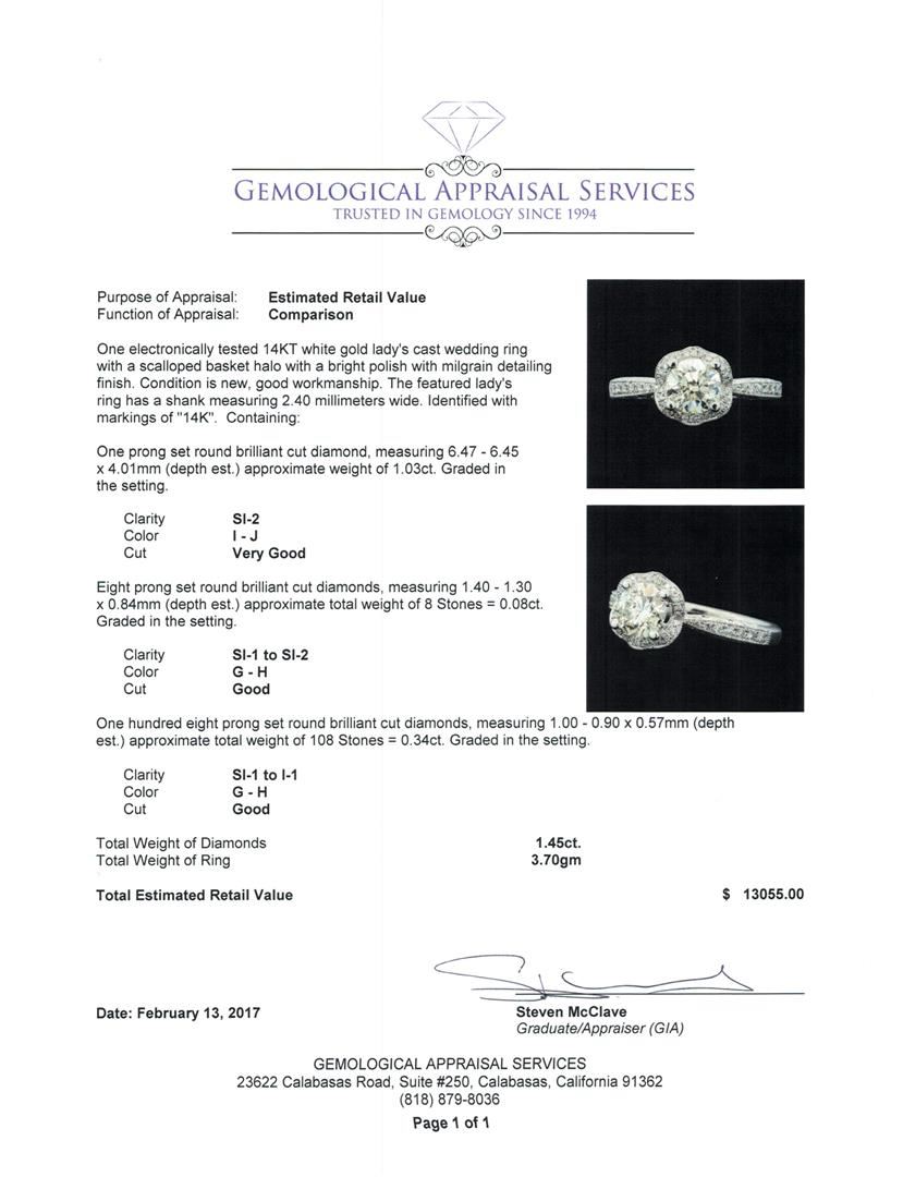 One electronically tested 14KT white gold lady's cast wedding ring with a scalloped basket halo with a bright polish with milgrain detailing finish. The featured lady's ring has a shank measuring 2.40 millimeters wide. Identified with markings of '14K'. Condition is new, good workmanship. Containing: One prong set round brilliant cut diamond, measuring 6.47 - 6.45 x 4.01mm (depth est.) approximate weight of 1.03ct. Graded in the setting. Clarity SI-2. Color: I - J Cut Very Good Eight prong set round brilliant cut diamonds, measuring 1.40 - 1.30 x 0.84mm (depth est.) approximate total weight of 8 Stones = 0.08ct. Graded in the setting. Clarity SI-1 to SI-2. Color: G - H Cut Good One Hundred Eight prong set round brilliant cut diamonds, measuring 1.00 - 0.90 x 0.57mm (depth est.) approximate total weight of 108 Stones = 0.34ct. Graded in the setting. Clarity SI-1 to I-1. Color: G - H Cut Good. Total Weight of Diamonds 1.45ct.. Total Weight of Ring 3.70gm. GAS Appraised at $13,055.00.