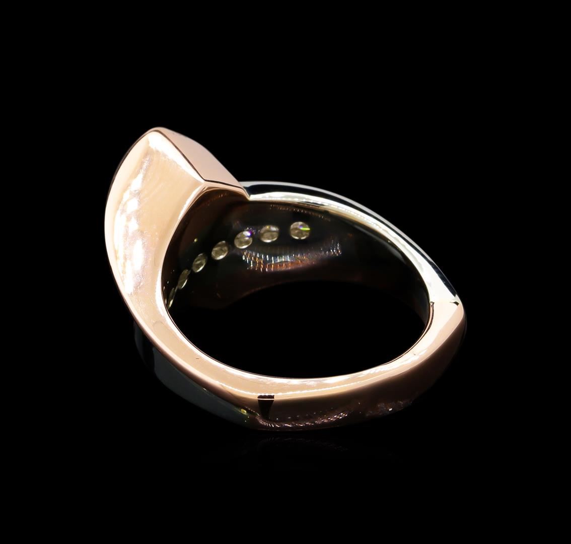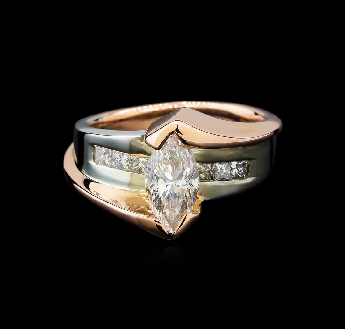 One 14K white and 14K pink gold ring. 9.82 GR. Main Gemstones: Identity: Natural diamond. Carat weight: 1.25 CTS TW. Shape and measurement: Marquis shape. Quality: SI clarity, I-J color. Adjacent Gemstones: Identity: Natural diamonds. Shape: Princess cut diamonds. Carat weight: 0.20 CTS TW. Quality: SI clarity, G-H color. All fine cutting and proportions. Total gemstones weight: 1.45 CTS TW. RBGS Appraised at $9,200.00.