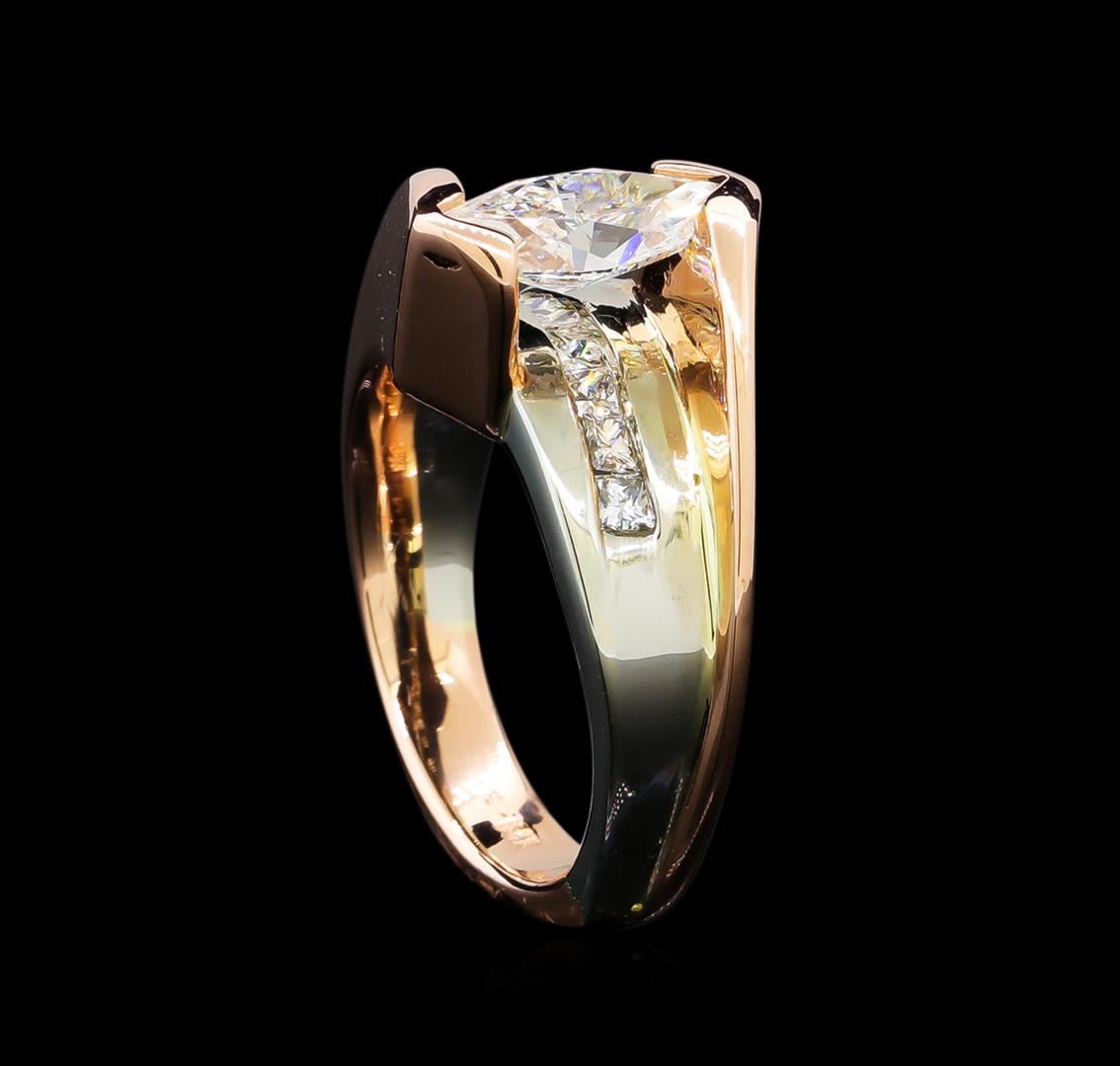 One 14K white and 14K pink gold ring. 9.82 GR. Main Gemstones: Identity: Natural diamond. Carat weight: 1.25 CTS TW. Shape and measurement: Marquis shape. Quality: SI clarity, I-J color. Adjacent Gemstones: Identity: Natural diamonds. Shape: Princess cut diamonds. Carat weight: 0.20 CTS TW. Quality: SI clarity, G-H color. All fine cutting and proportions. Total gemstones weight: 1.45 CTS TW. RBGS Appraised at $9,200.00.
