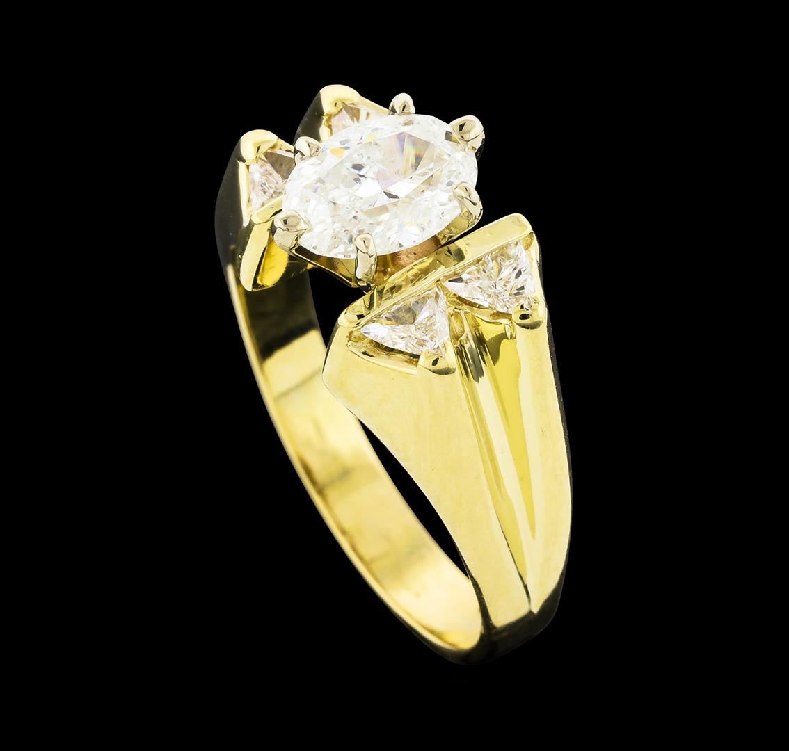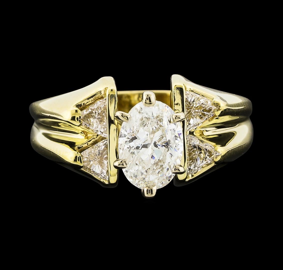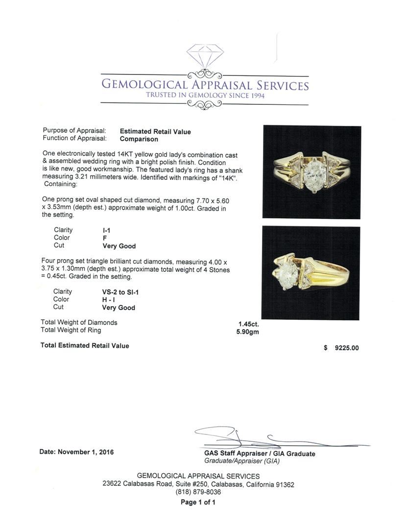 One electronically tested 14KT yellow gold lady's combination cast & assembled wedding ring with a bright polish finish. The featured lady's ring has a shank measuring 3.21 millimeters wide. Identified with markings of '14K'. Condition is like new, good workmanship. Containing: One prong set oval shaped cut diamond, measuring 7.70 x 5.60 x 3.53mm (depth est.) approximate weight of 1.00ct. Graded in the setting. Clarity I-1. Color: F Cut Very Good Four prong set triangle brilliant cut diamonds, measuring 4.00 x 3.75 x 1.30mm (depth est.) approximate total weight of 4 Stones = 0.45ct. Graded in the setting. Clarity VS-2 to SI-1. Color: H - I Cut Very Good. Total Weight of Diamonds 1.45ct.. Total Weight of Ring 5.90gm. GAS Appraised at $9,225.00.